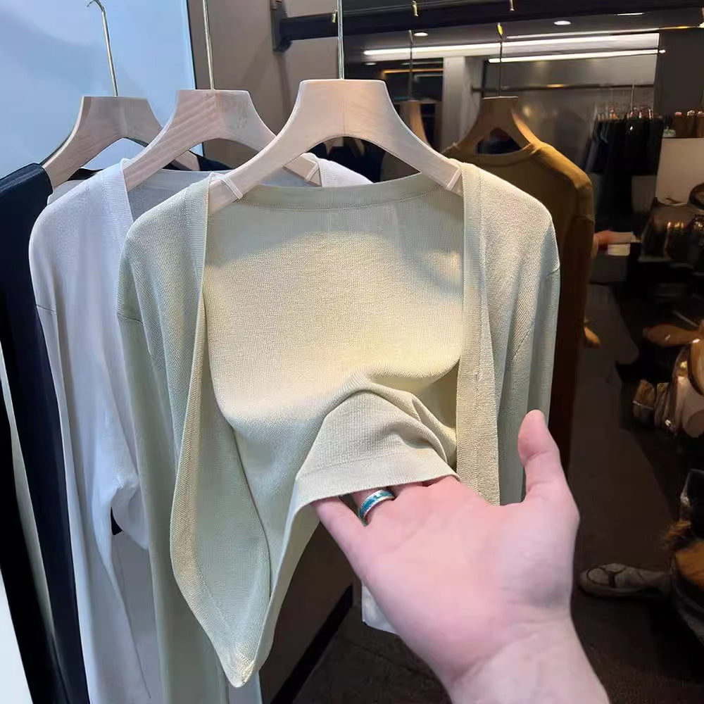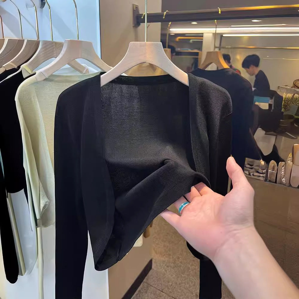 White short ice silk knitted cardigan women's thin 2025 summer suspender skirt with tulle jacket outside, air-conditioned blouse
