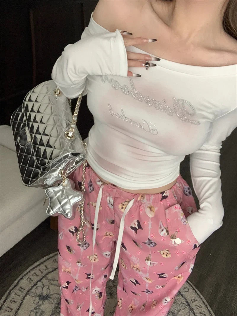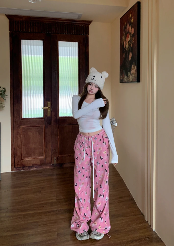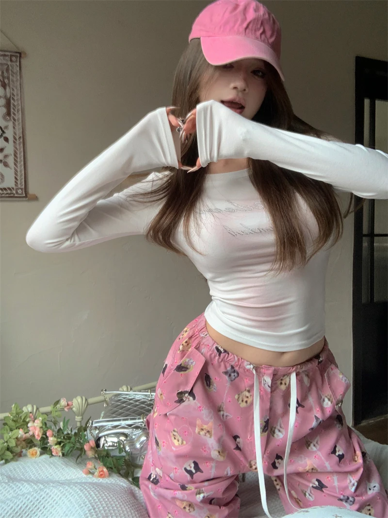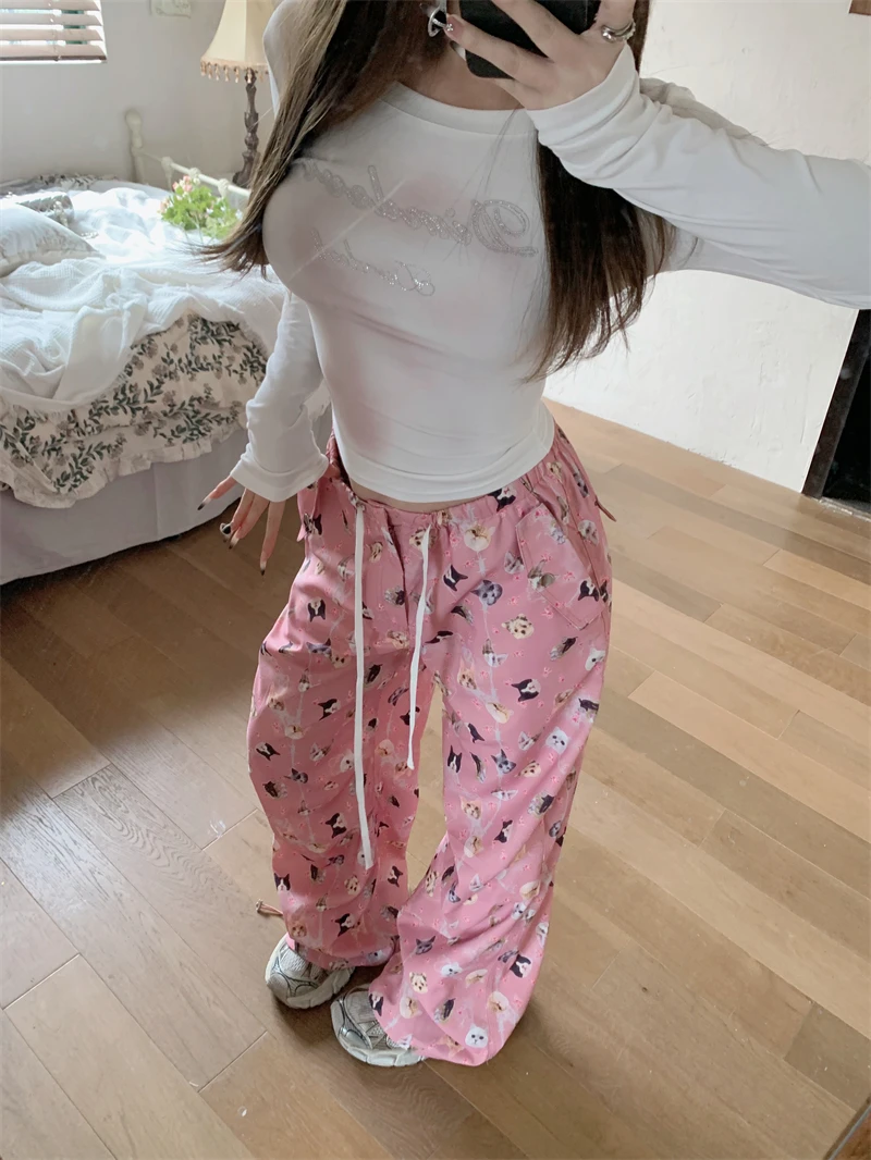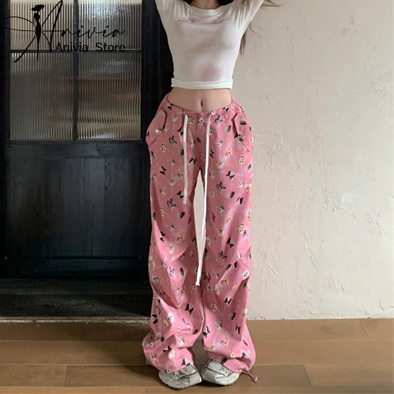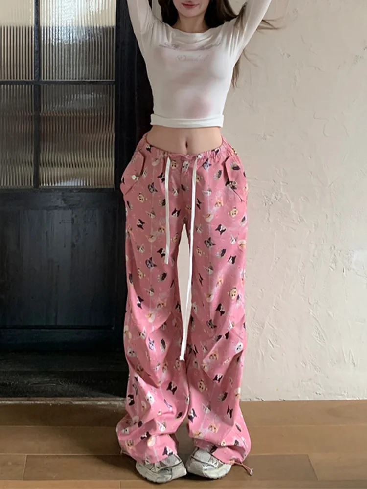 Women Baggy Pink Cargo Pants Vintage Harajuku Y2k 90s Aesthetic Retro Graphic Print Pants High Waist Trousers 2000s Clothes 2024