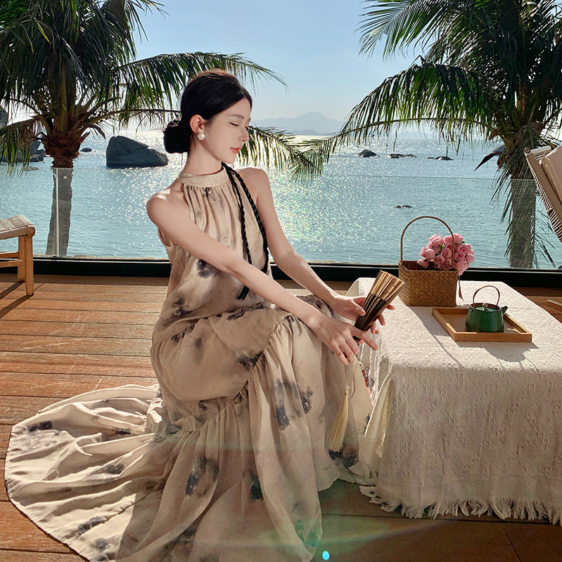 2025 New Chinese style temperament printed long dress apricot high-end sleeveless dress women loose and thin wear women's clothing