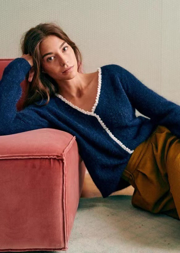 2025 new retro lace V-neck mohair blend long-sleeved knitted cardigan jacket lazy wind sweater jacket