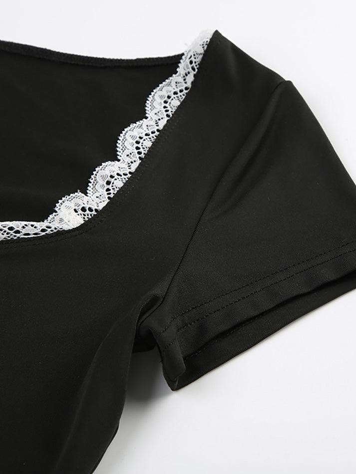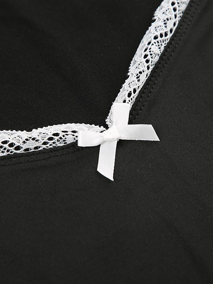 Bow Accent Lace-Trim Plain Slim-Fit Crop Top
