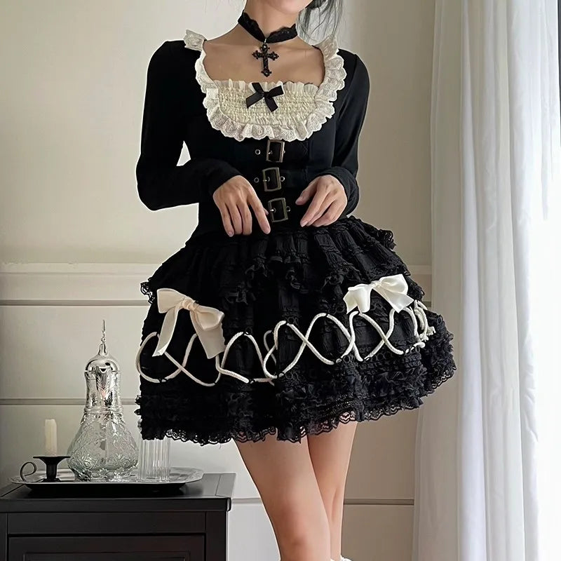 Karrram Japanese Y2k Black Short Skirt Vintage Gothic Lace Mini Skirt Lolita Harajuku Ball Gown Skirt 2000s Aesthetic Cake Skirt
