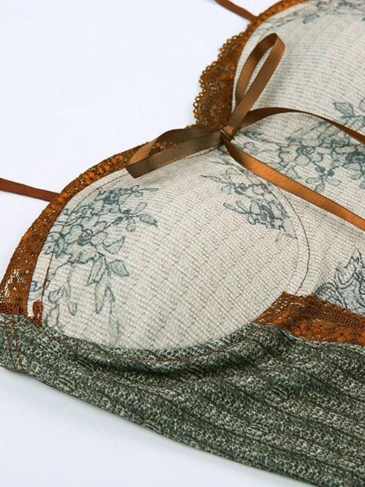Description: Made from lightweight stretch knit fabric, this corset cami top is soft and comfortable to wear. They have lace paneled design, a satin tie to the front, and with random pattern featuring on the body.
