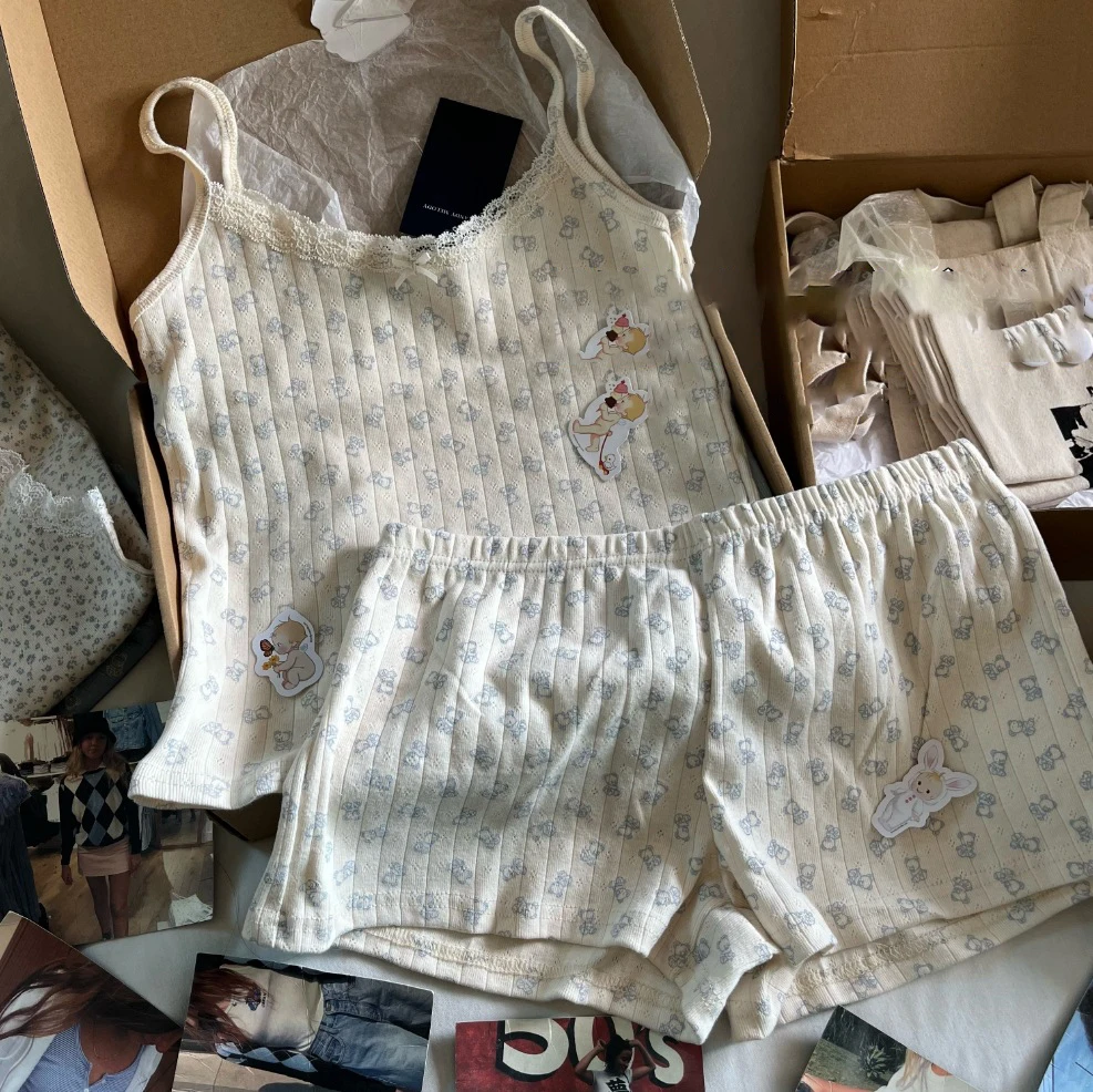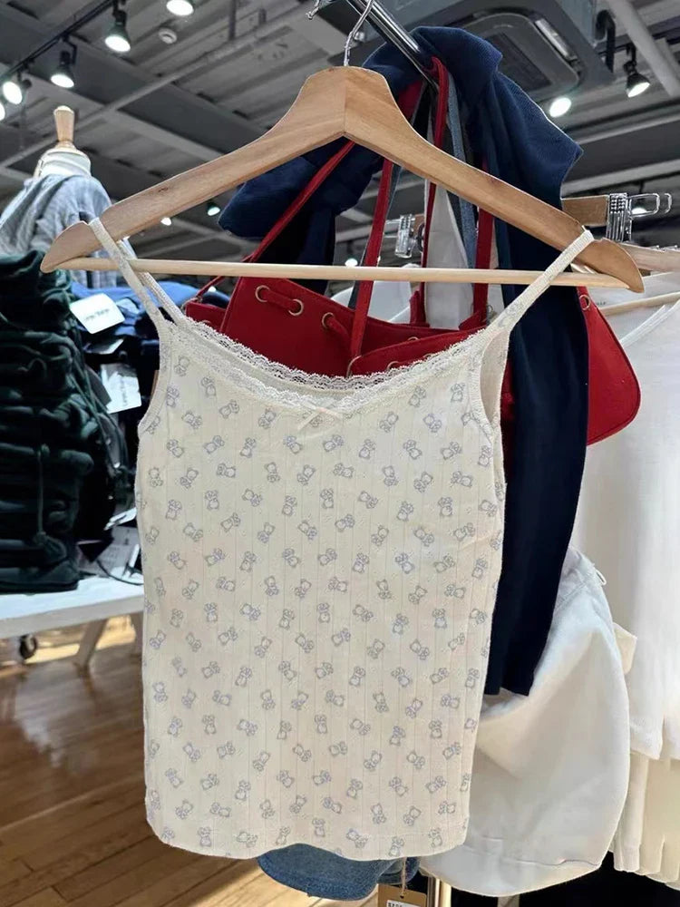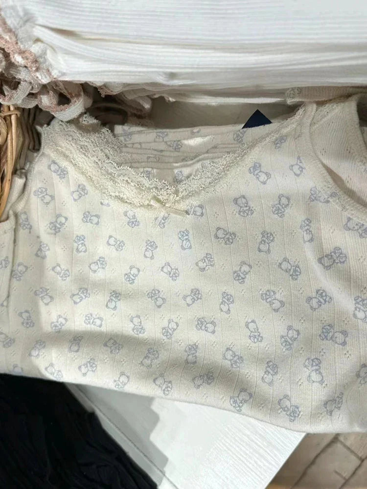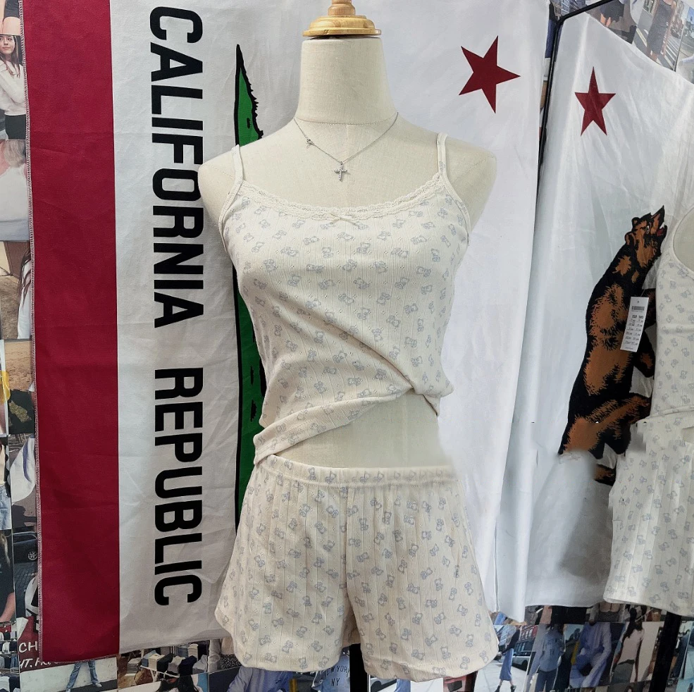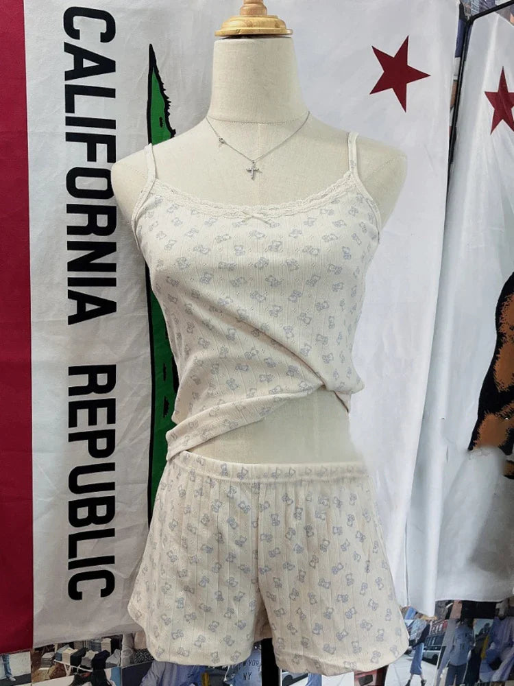 Little Bear Eyelet Cotton Vest Shorts Set Summer Sweet Bow Lace Camis Tops And Shorts Vintage Cute 2 Piece Sets Women Outfit New