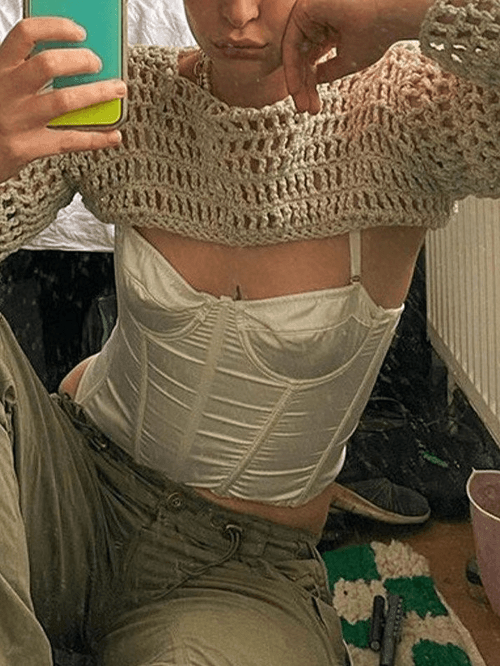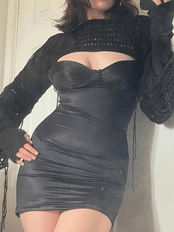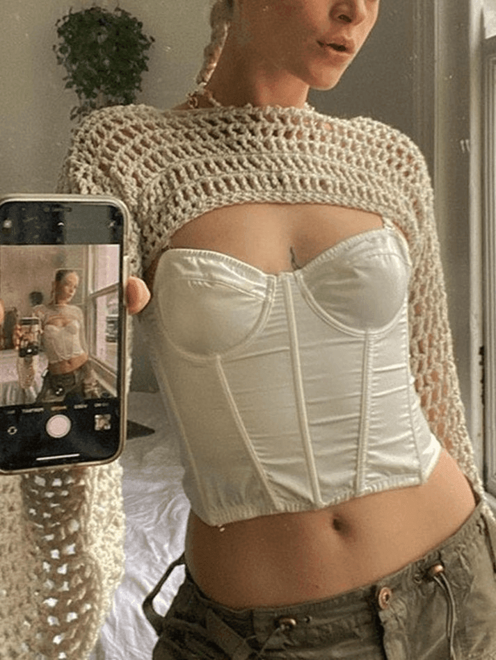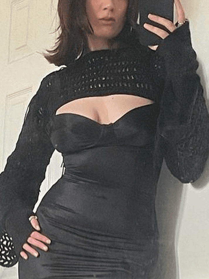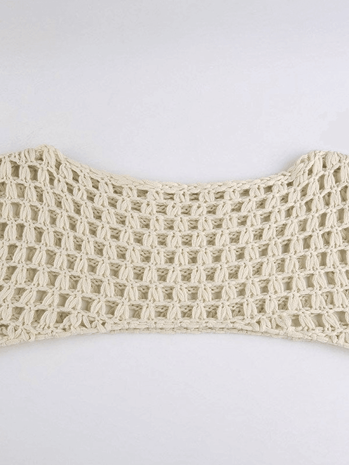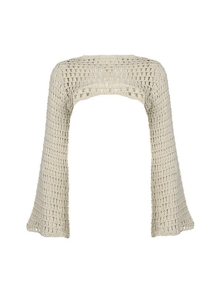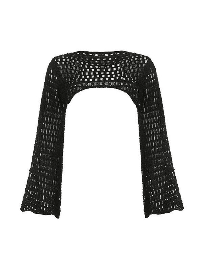 Description: Absolutely love this crochet bolero for festival edits. Shaped to a super crop length, crafted from crochet hollow knit fabric, features flared cuffs design.