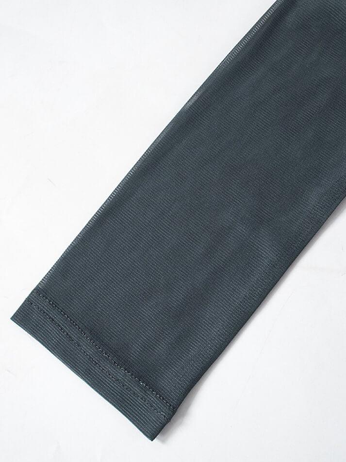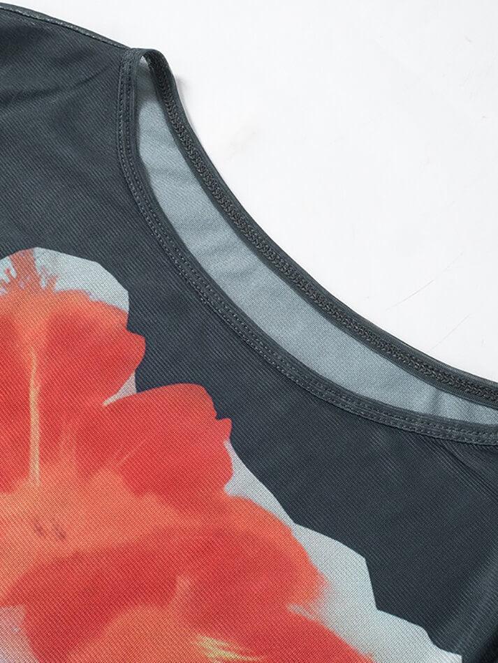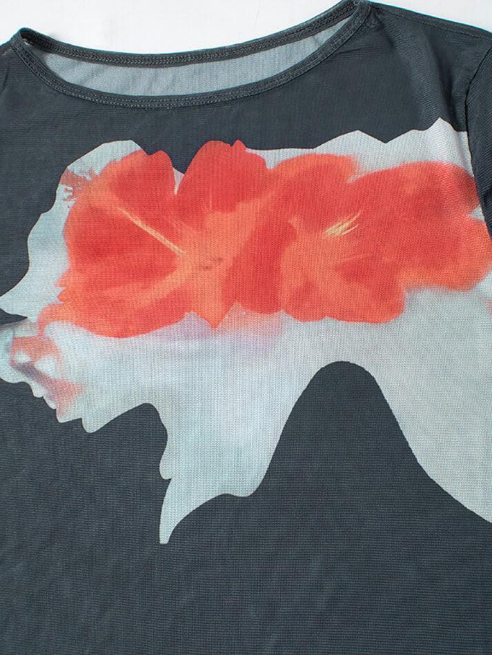 Mesh Printed Round Neck Pullover Long Sleeve Top