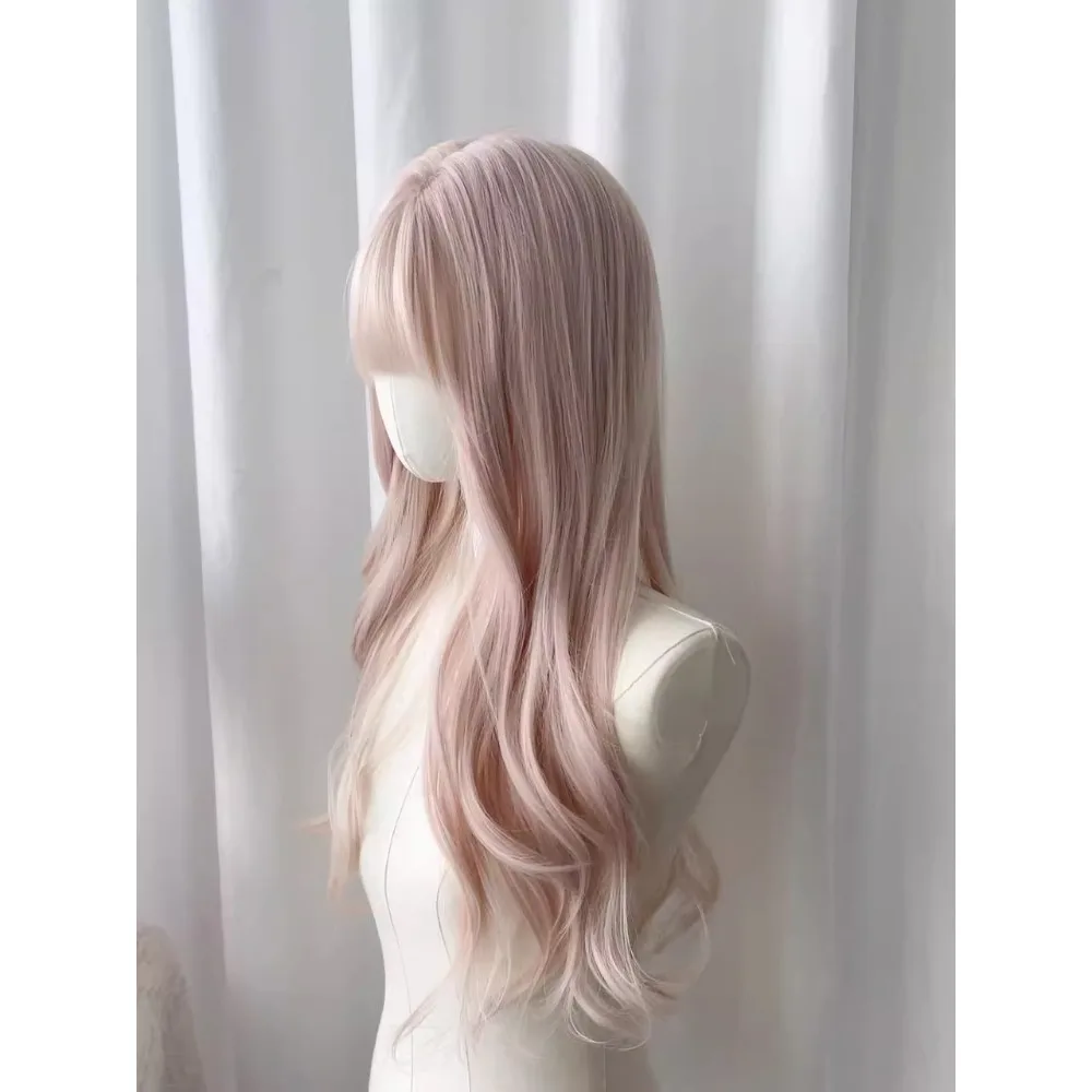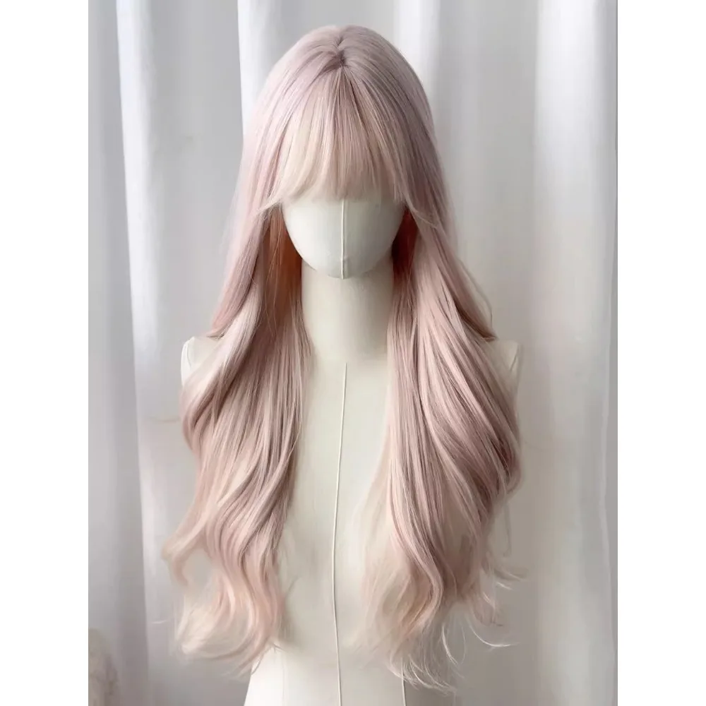 OKLULU - Baby Pink Wig with Bangs Long Wavy Hair Lolita Wig for Women 24inch Natural Daily Use Cosplay Wave Headband Wigs
