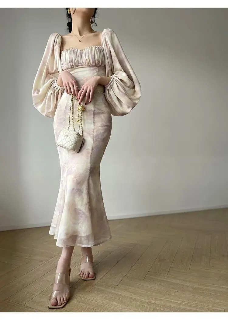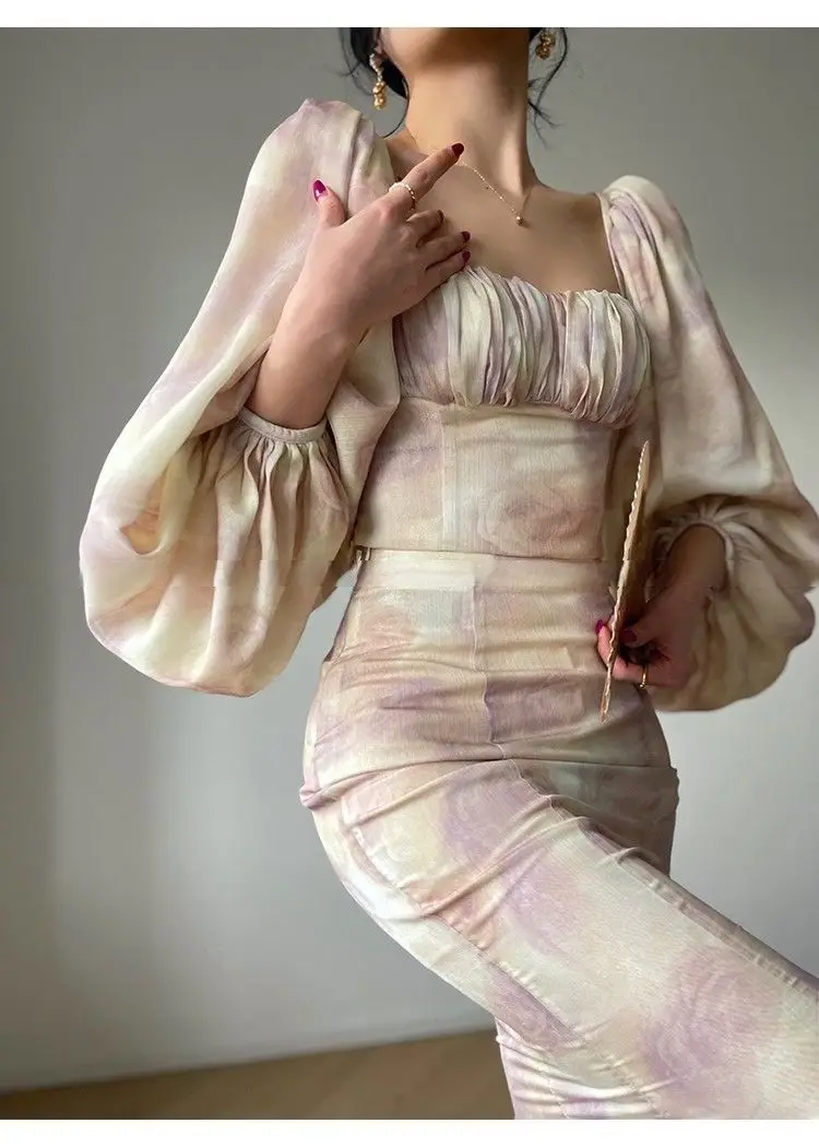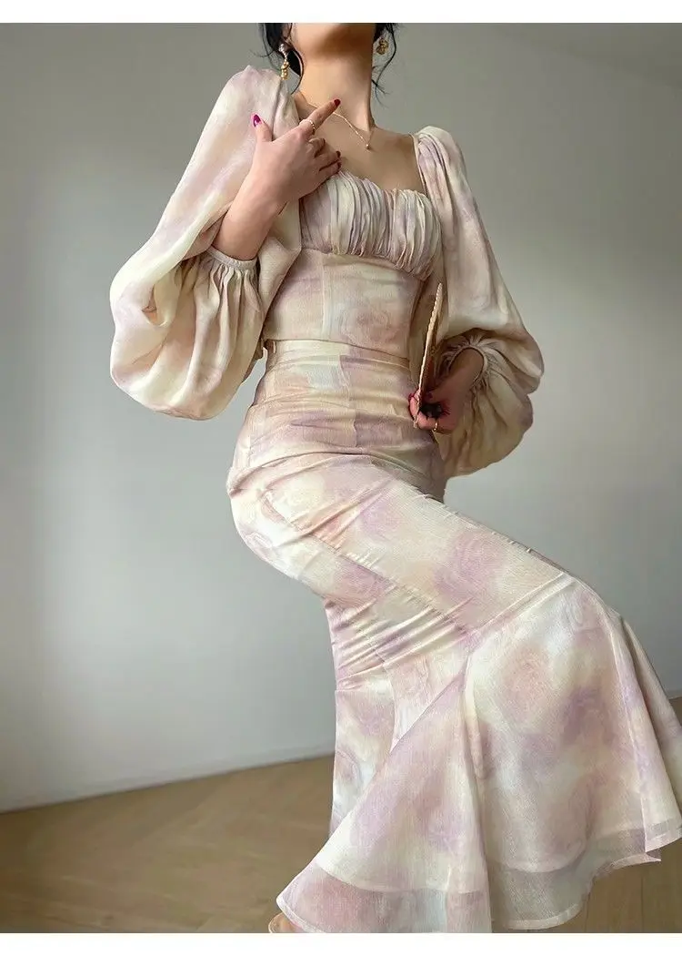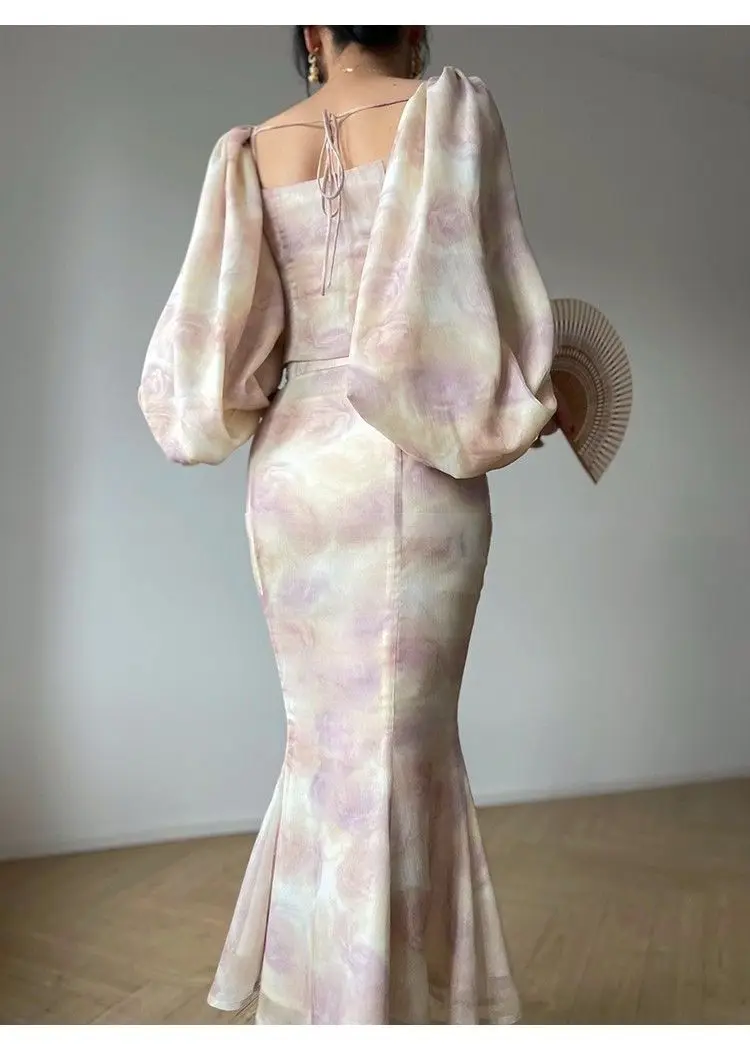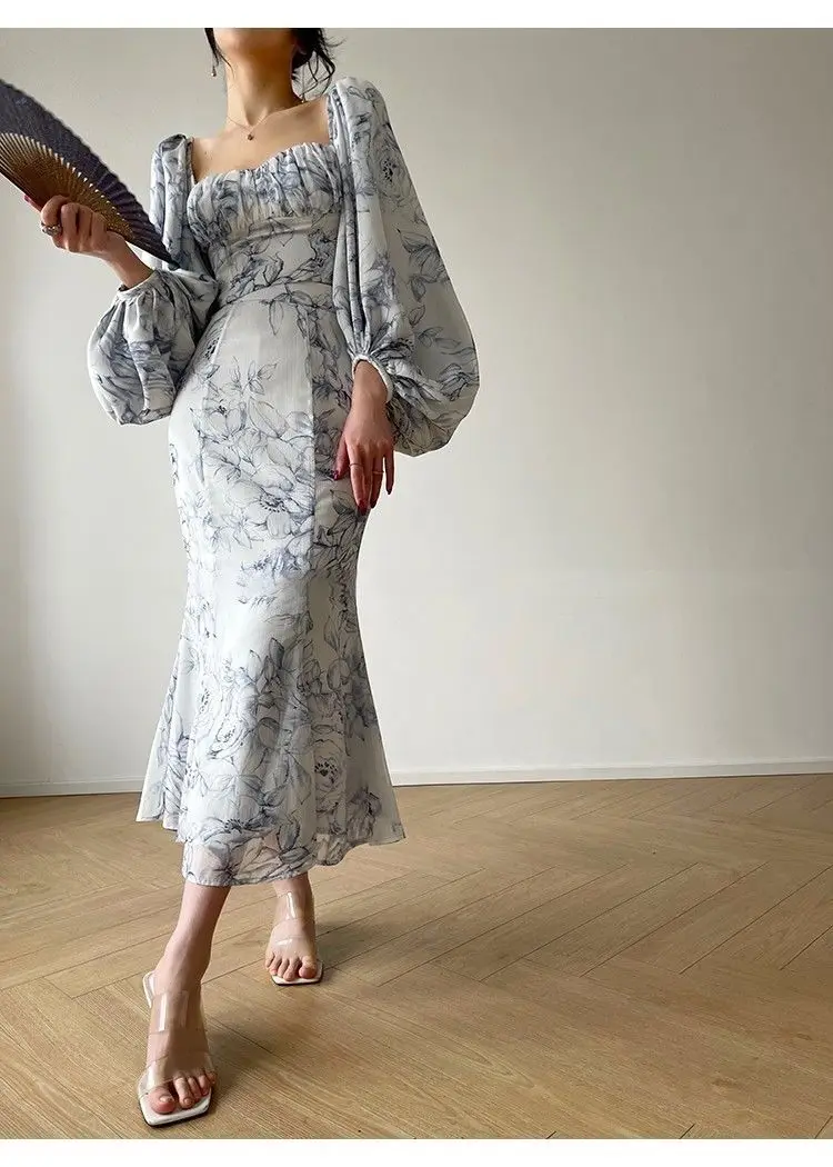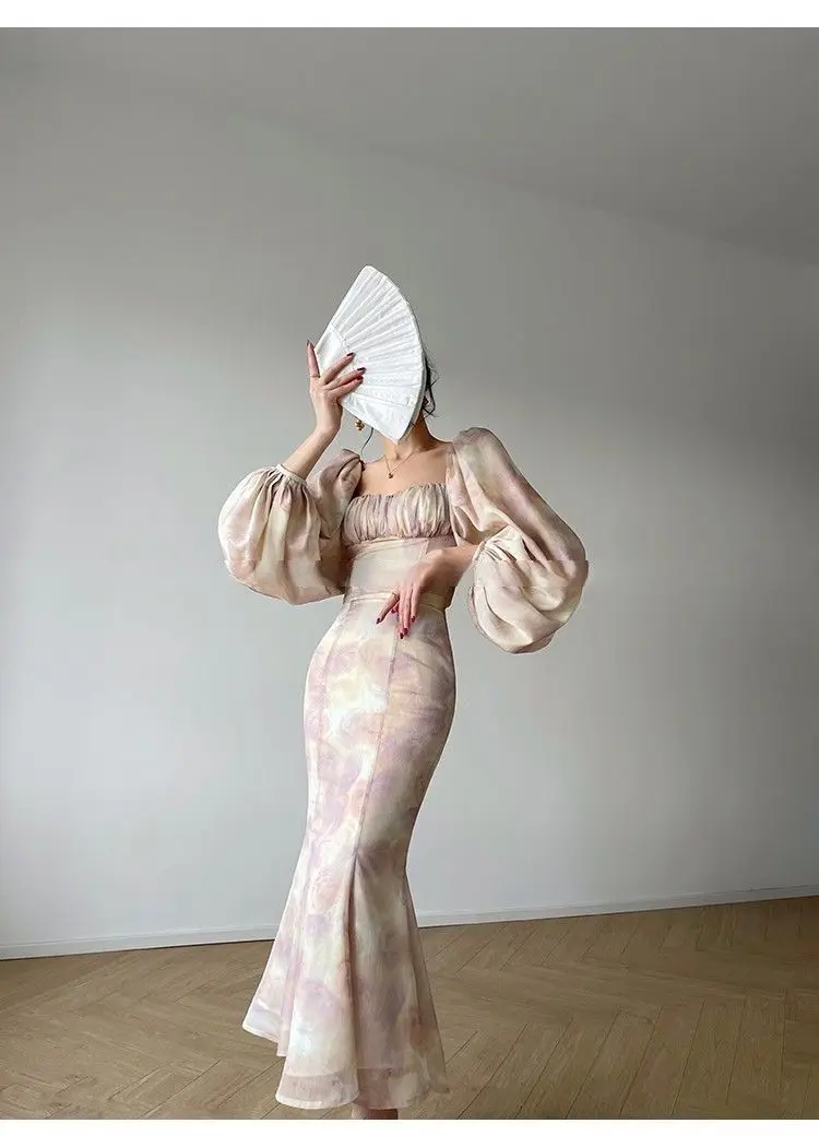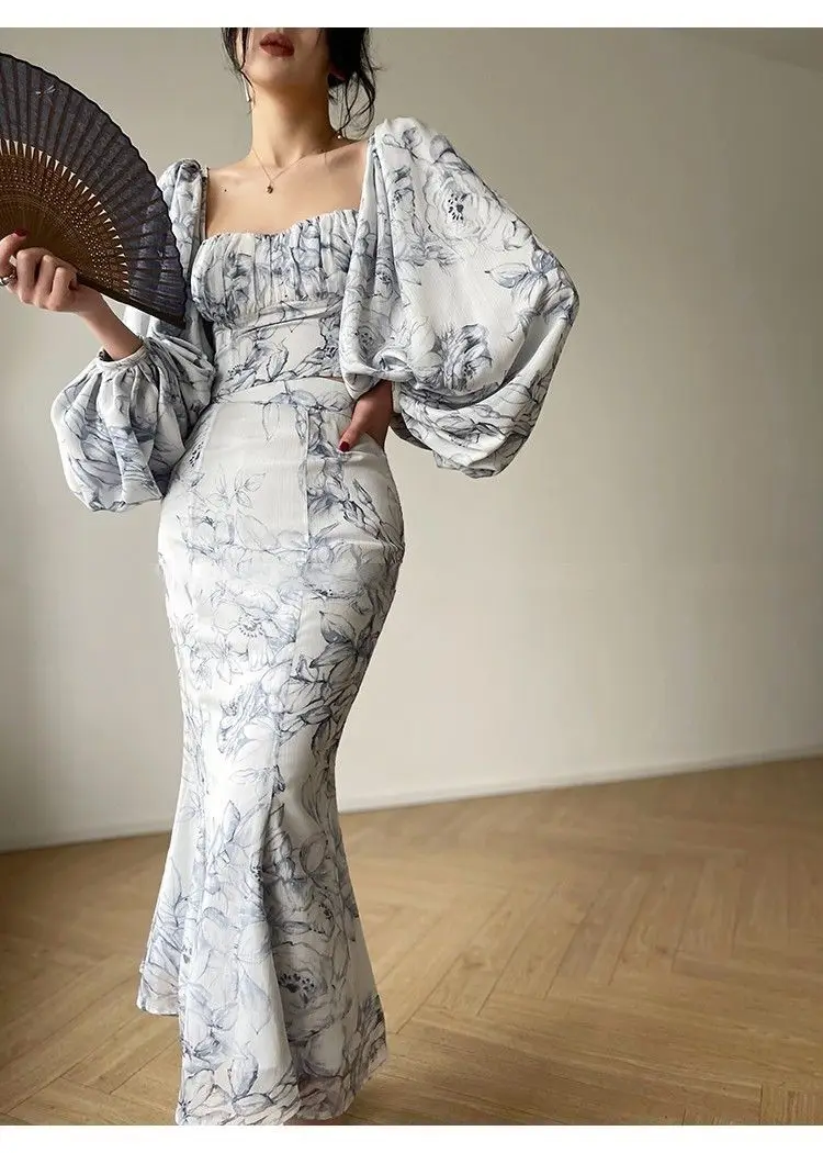qgtao 2 Piece Set For Women Dress Sets Spring 2023 New French Elegant Square Collar Floral Lantern Sleeve Top Prom Fishtail Skirt Suit