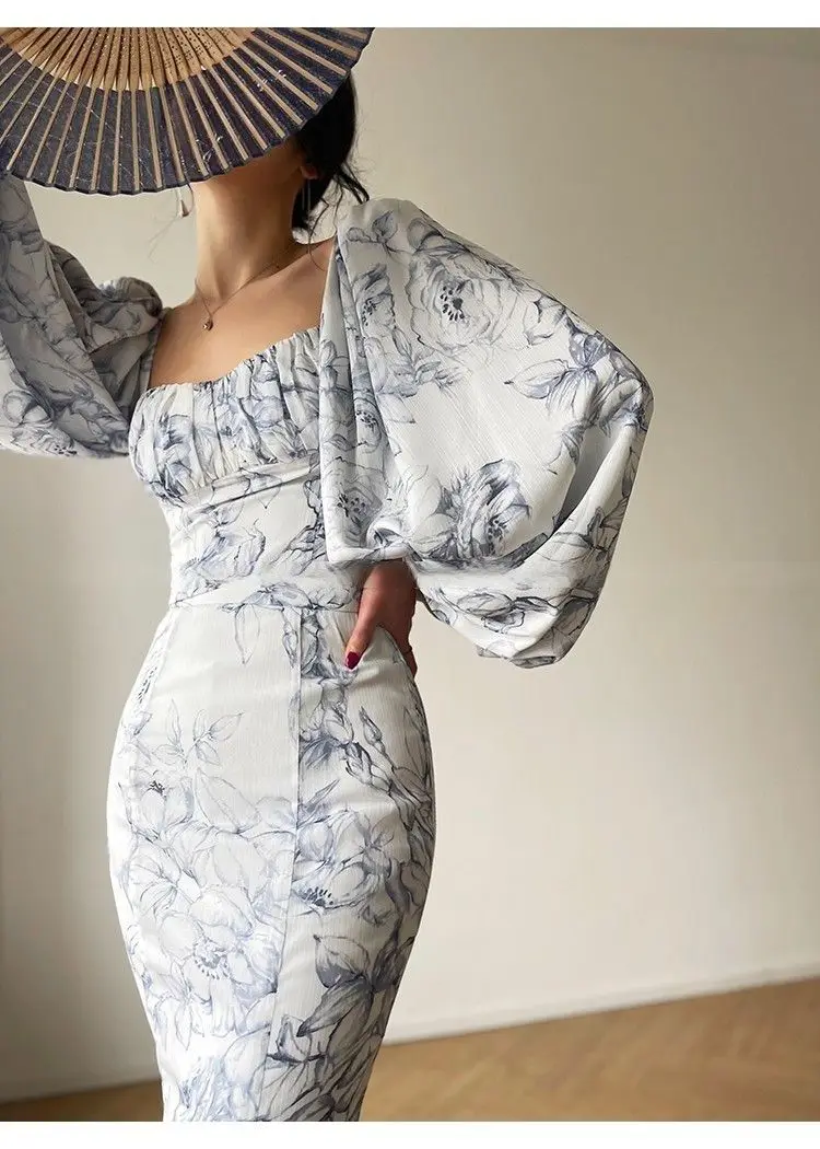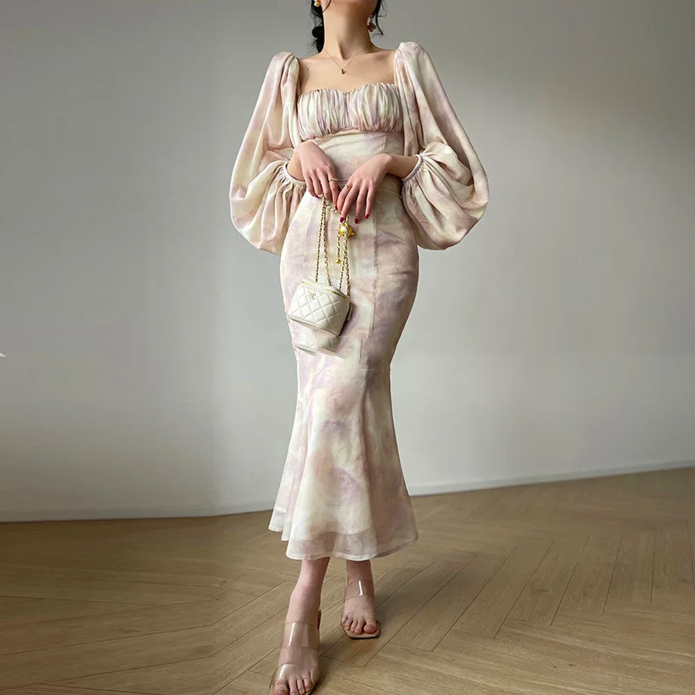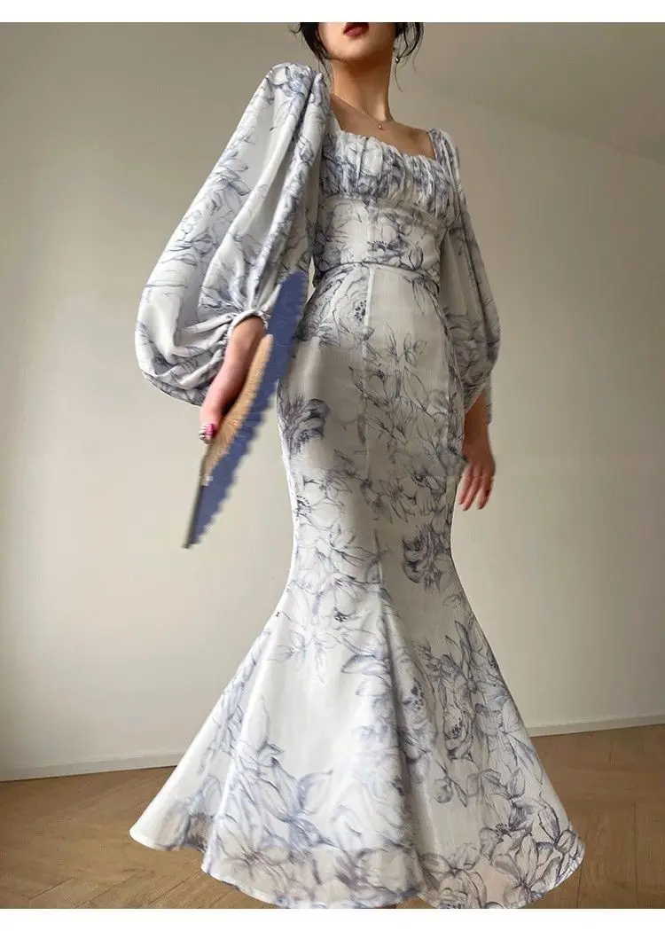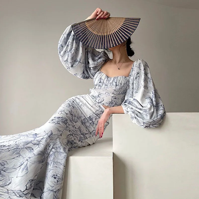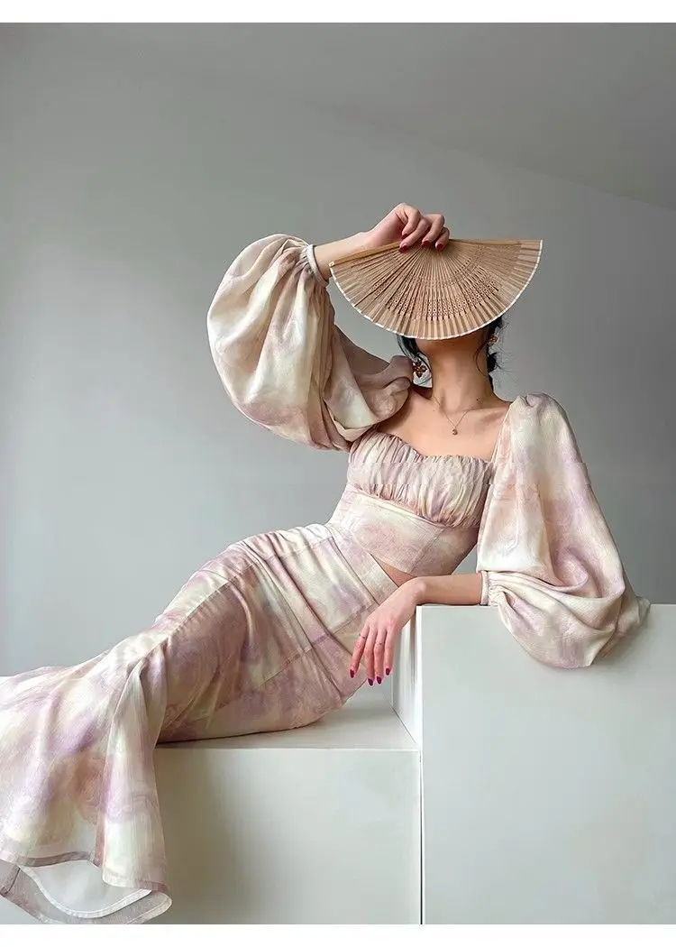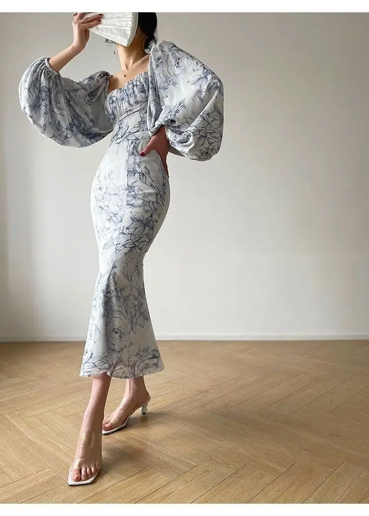 qgtao 2 Piece Set For Women Dress Sets Spring 2023 New French Elegant Square Collar Floral Lantern Sleeve Top Prom Fishtail Skirt Suit