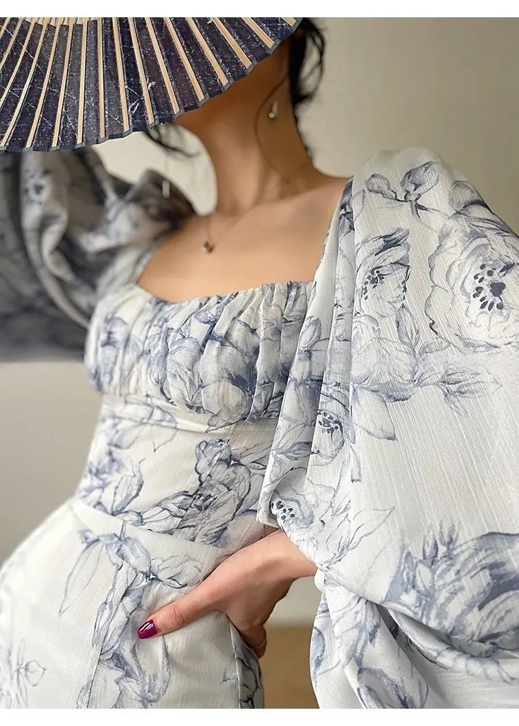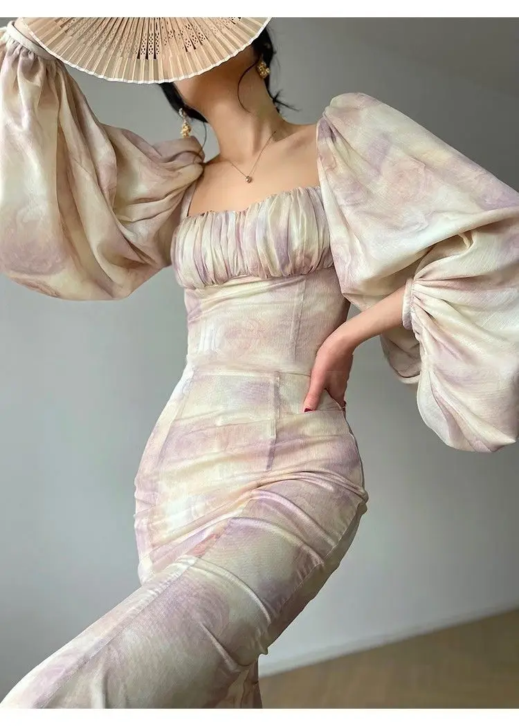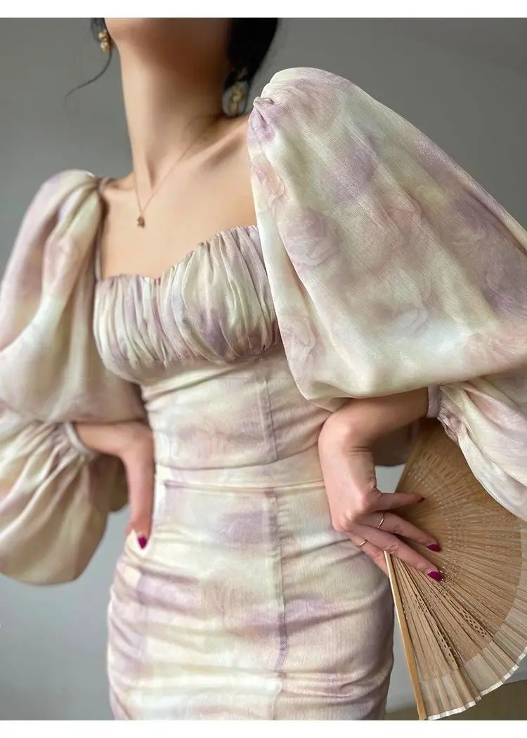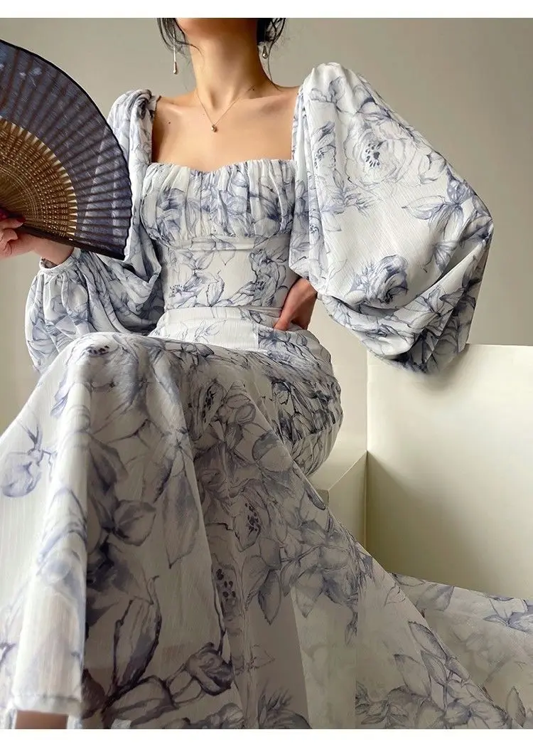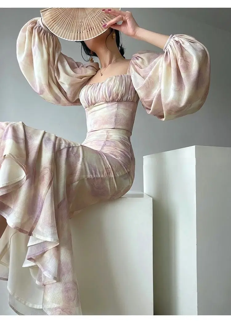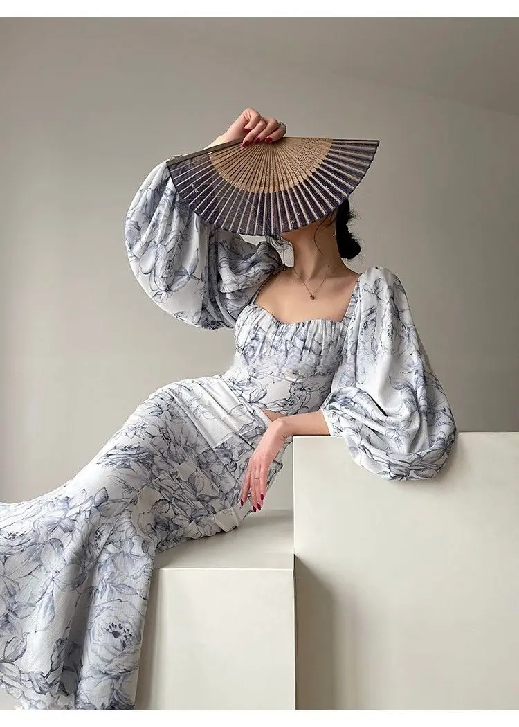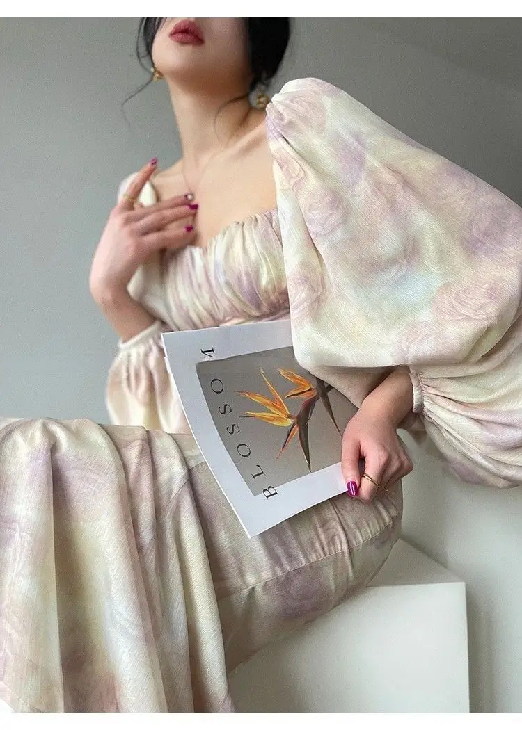 qgtao 2 Piece Set For Women Dress Sets Spring 2023 New French Elegant Square Collar Floral Lantern Sleeve Top Prom Fishtail Skirt Suit