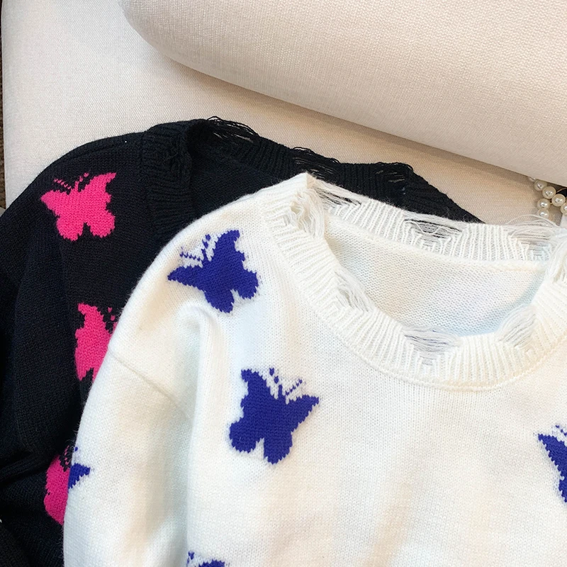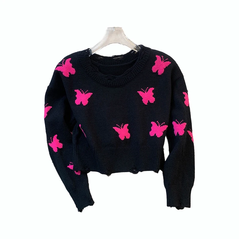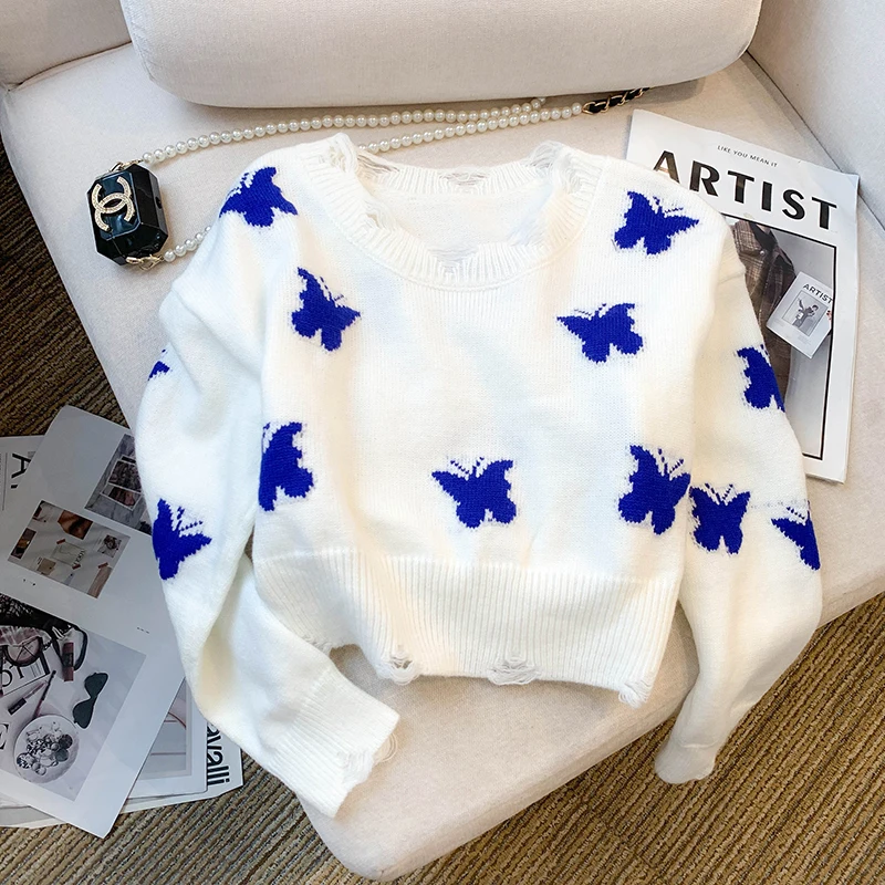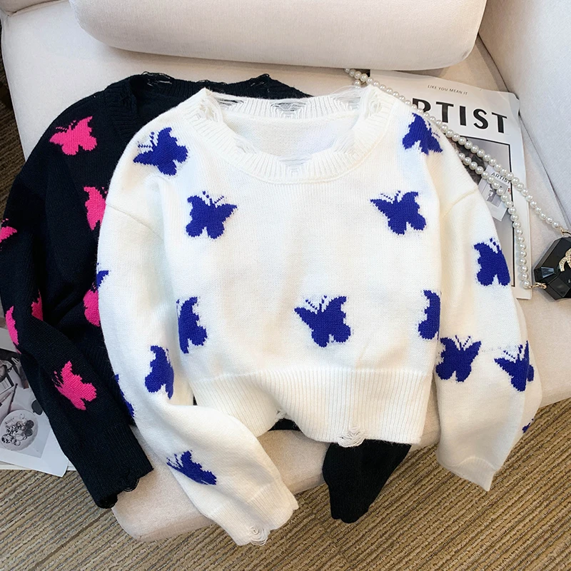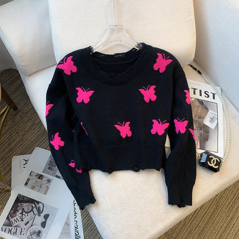 qgtao 2024 Fall fashion new Korean version design sense holes chic butterfly short crew-neck sweater long sleeve sweater women