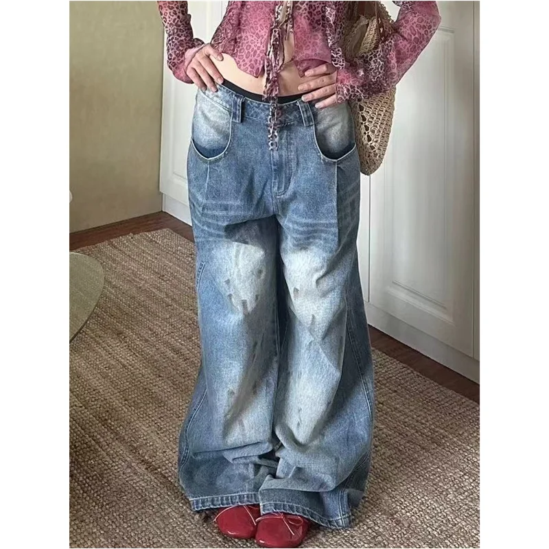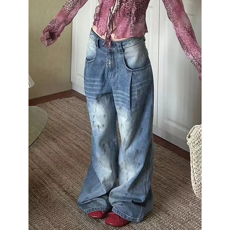 qgtao - Autumn Womens Blue Jeans High Waist Baggy Casual Vintage Y2K Design Sense Straight Pants Street American Wide Leg Denim Trouser