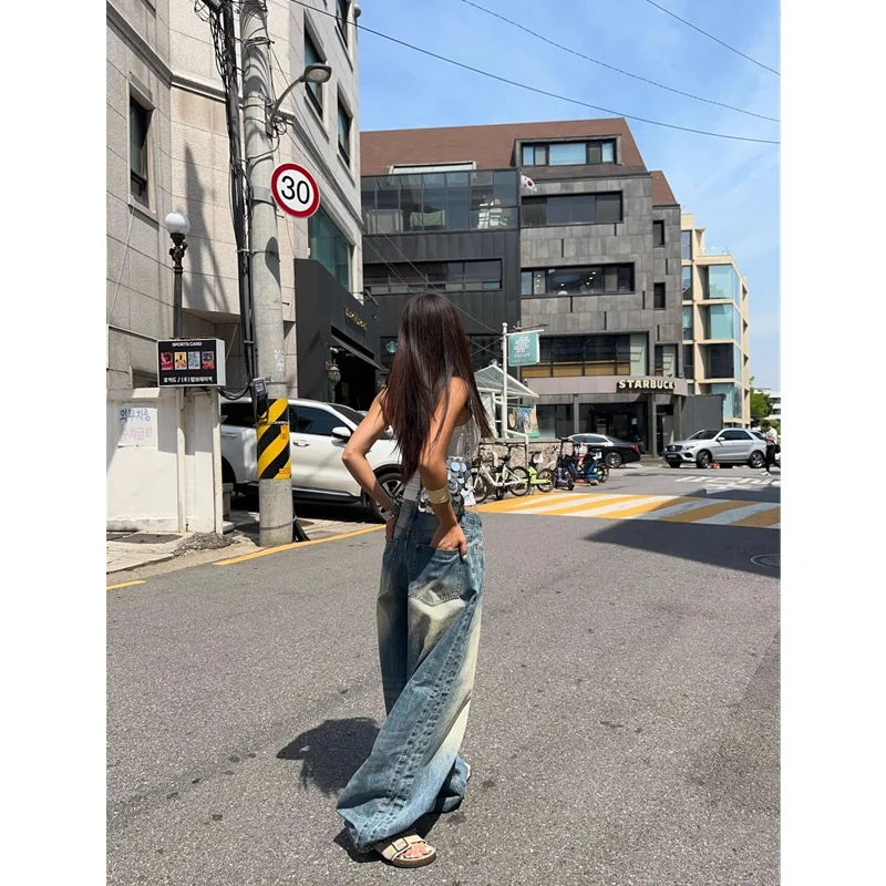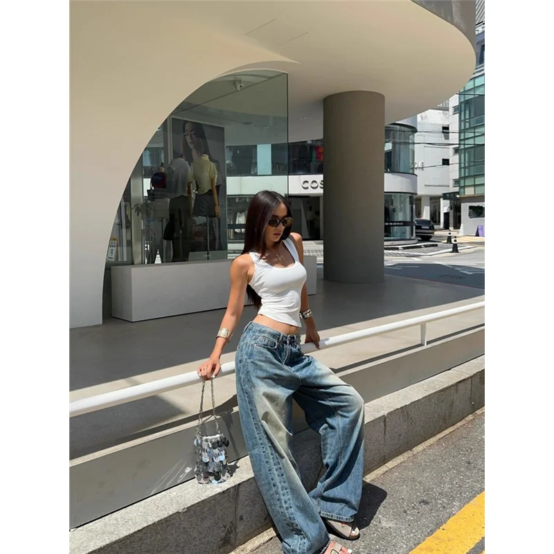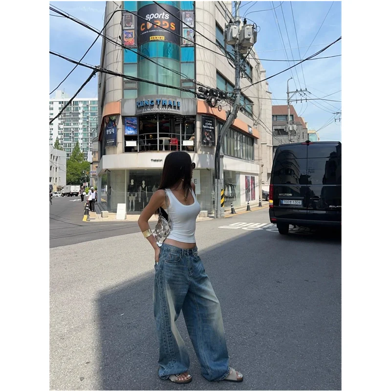 qgtao - Blue Womens Jeans High Waist Vintage Straight Summer Design Sense Denim Pants Streetwear American Wide Leg Baggy Denim Trouser