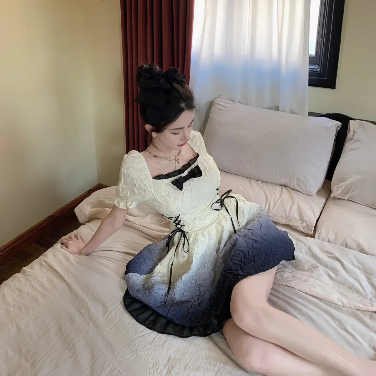 qgtao Bubble Sleeve Kawaii Lolita Mini Dress Women Pink Bow Princess Sweet Party Cute Dress A-Line Elegant Fairy Dress 2024 Spring New