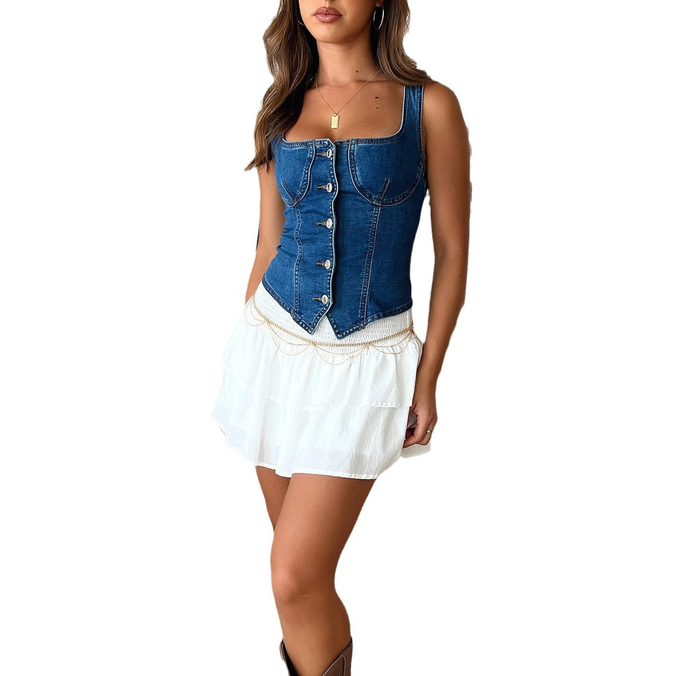 cowgirl outfits Women's New Dark Denim Small Vest Breasted Shoulder Strap Solid Color Sling Top Vest Hot Selling Su3853