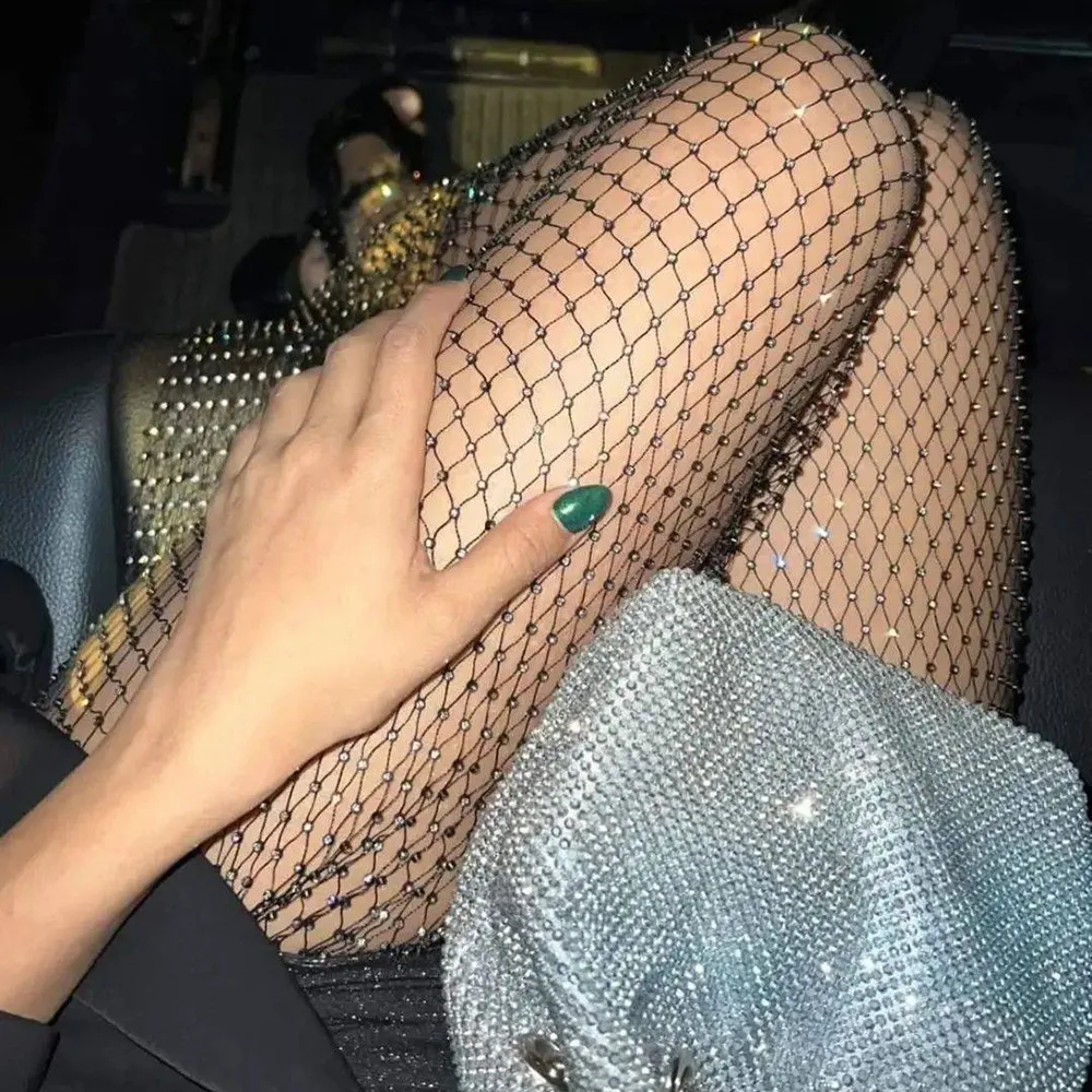 qgtao Crystal Diamond Shiny Women Pants Sexy Hollow Out See Through Fishnet Elastic Trousers Fashion Summer Beach Party Club Pant