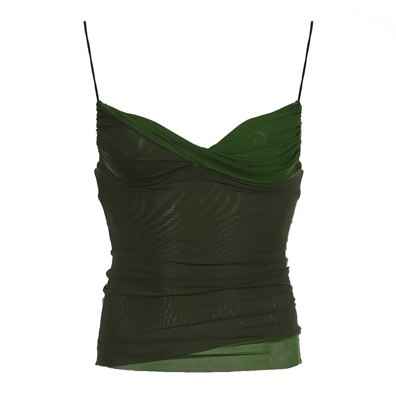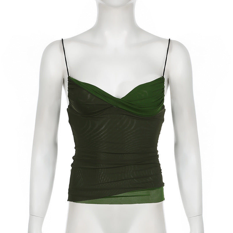 dream clothes Millennium Hot Girl Style Retro Green Mesh Stitching Camisole Ins Fresh Contrast Color V-neck Slim Top for Women