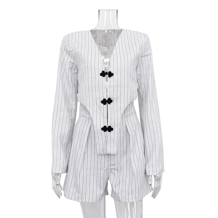dti outfits 2024 Spring Women's Clothing New Chinese Style Niche Long Sleeve Deep V Top Coat High Waist Shorts Striped Suit