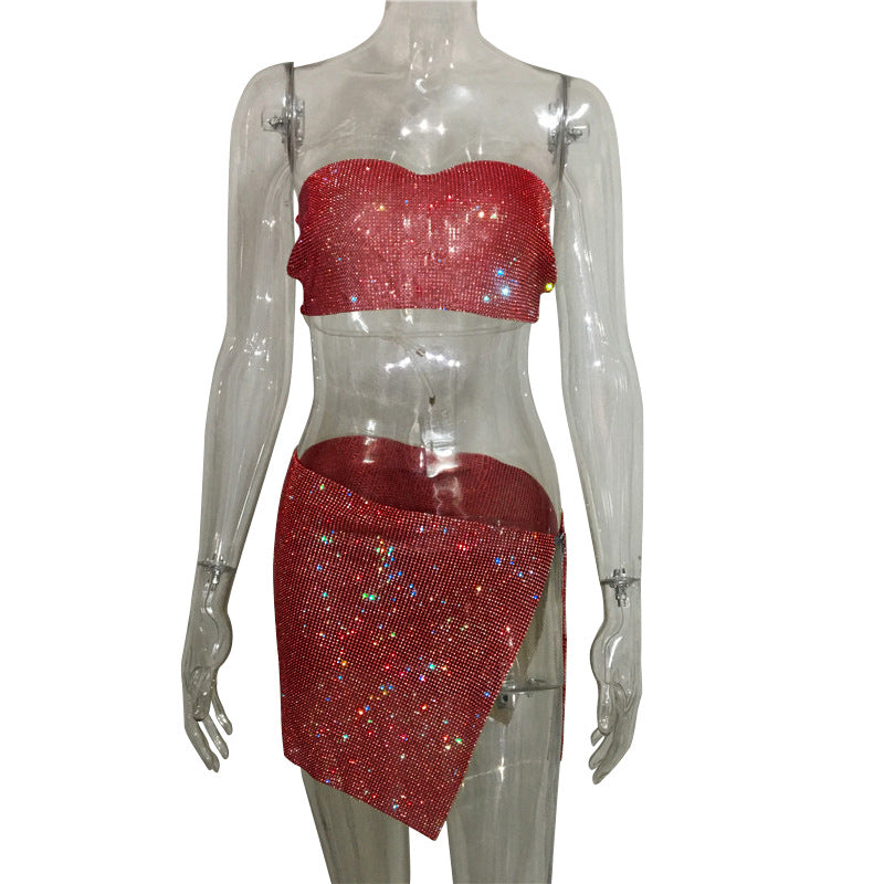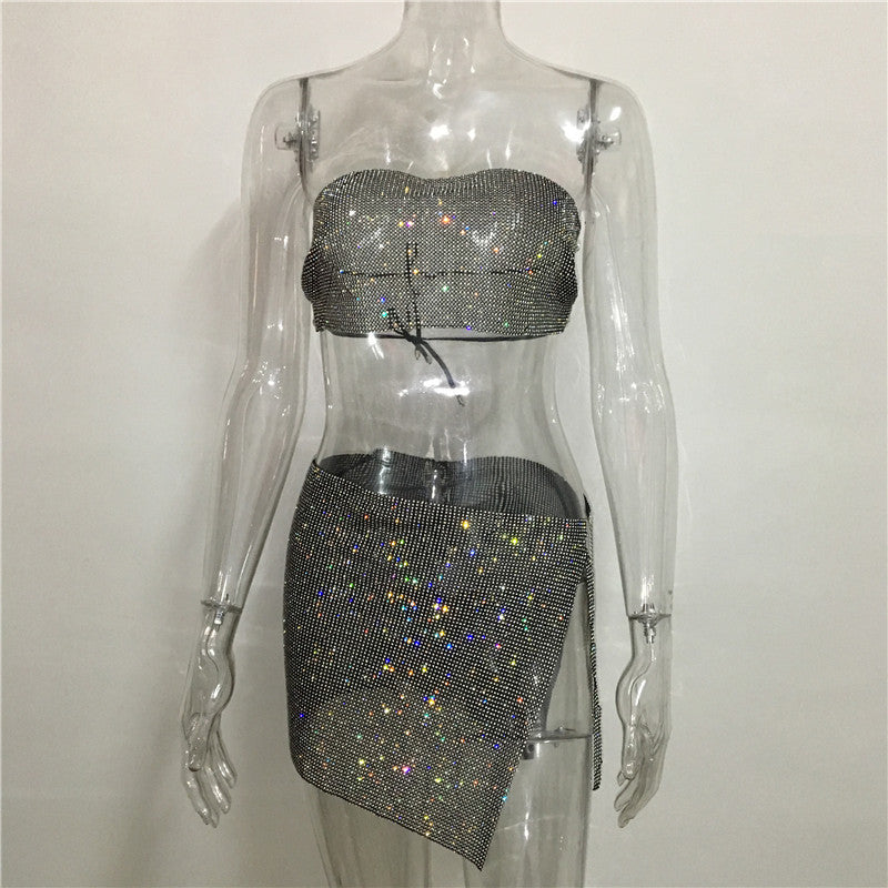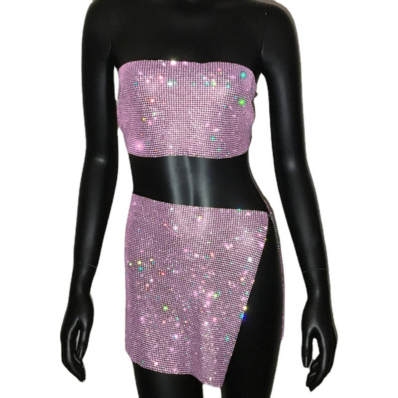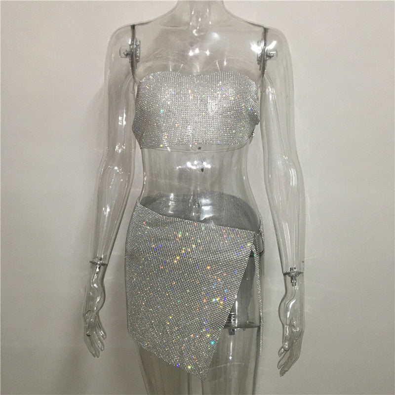 dti outfits Fashion Nightclub Women's Personalized Rhinestone Metal Tube Top Skirt Suit Hot Girl Flash Diamond Top