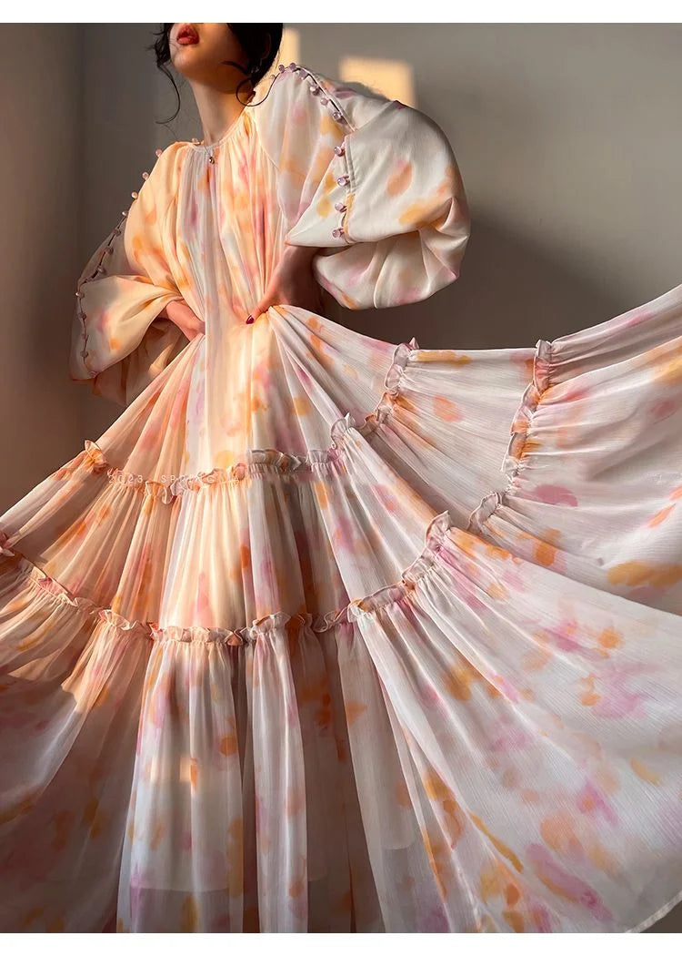 qgtao Elegant Print Midi Dresses For Women 2024 Spring Summer New French Fashion Sweet Vintage Female Clothes Loose Maxi Y2k Dress