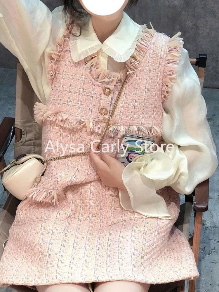 qgtao Fairy Sweet Two Piece Set Women Autumn Vintage Elegant Shirt Pink Cute Dress Set Casual Korean Style Formal Party Dress Set 2024