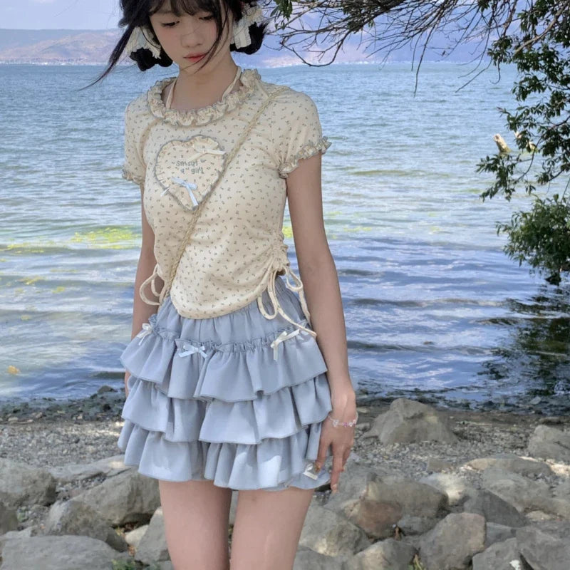 qgtao Kawaii Lolita Ruffle Women Skirt Cutecore Sweet Japanese Style Mini Skirts Layered Bow Patchwork Pleated Short Skirt