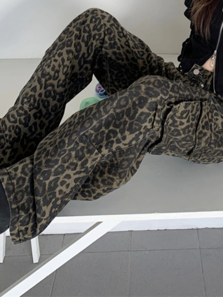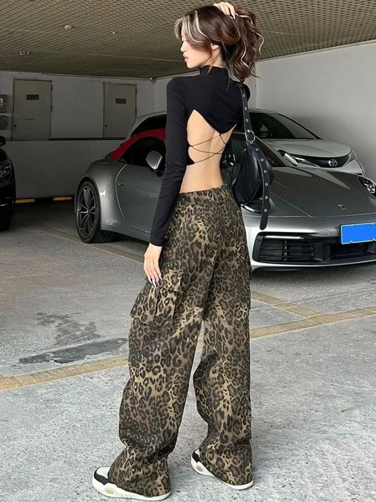 qgtao Leopard Print Pants Women Y2K High Waist Multiple Pockets Vintage Trousers Streetwear Hip Hop Loose Wide Leg Cargo Jeans