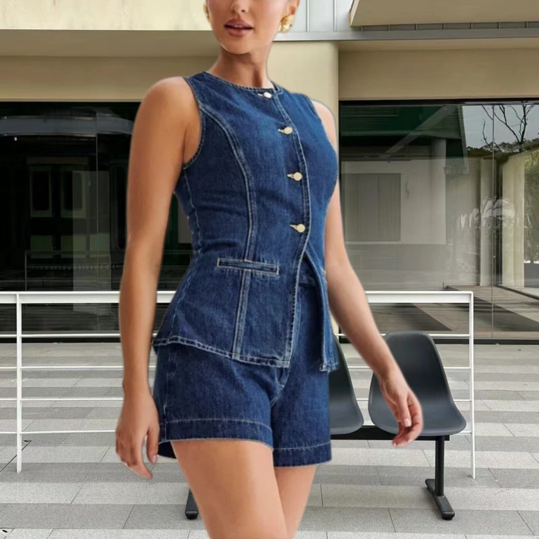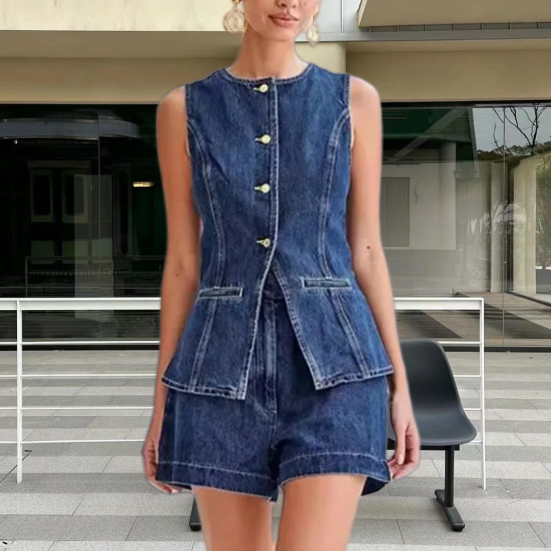 outfit inspo 2024 New Fashion Casual Single-Breasted Sleeveless Top High Waist Shorts Denim Suit