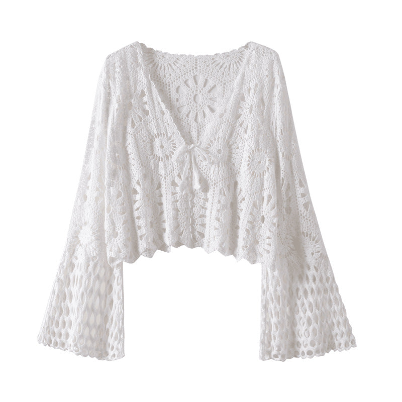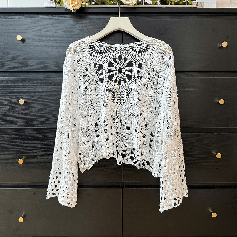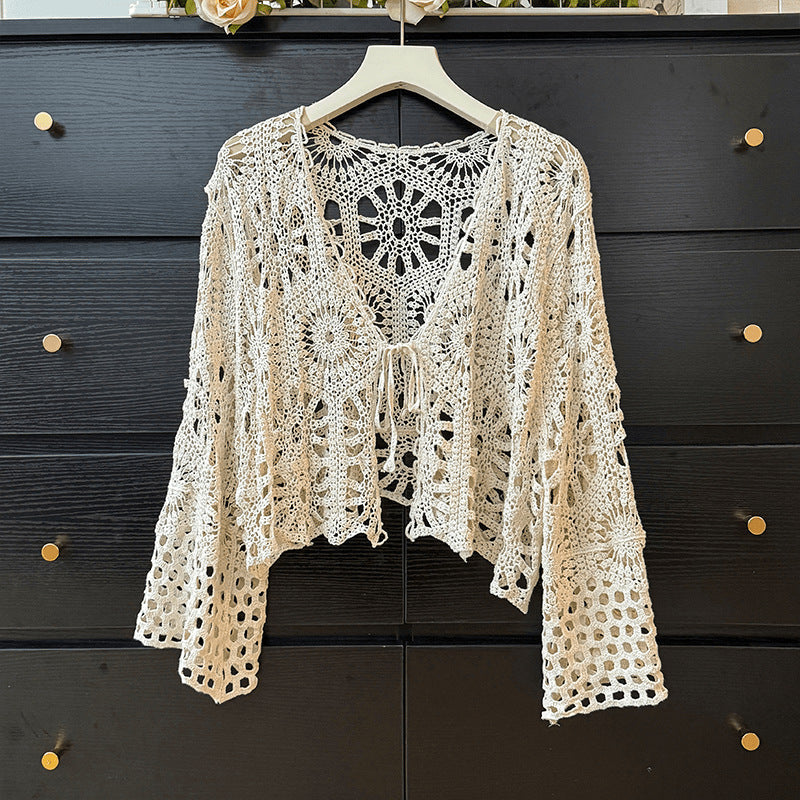 outfit inspo Bohemian Ethnic Style Hollow-out Crocheted Thin Long-Sleeved Knitted Cardigan Women's Summer Lace-up Top Al202