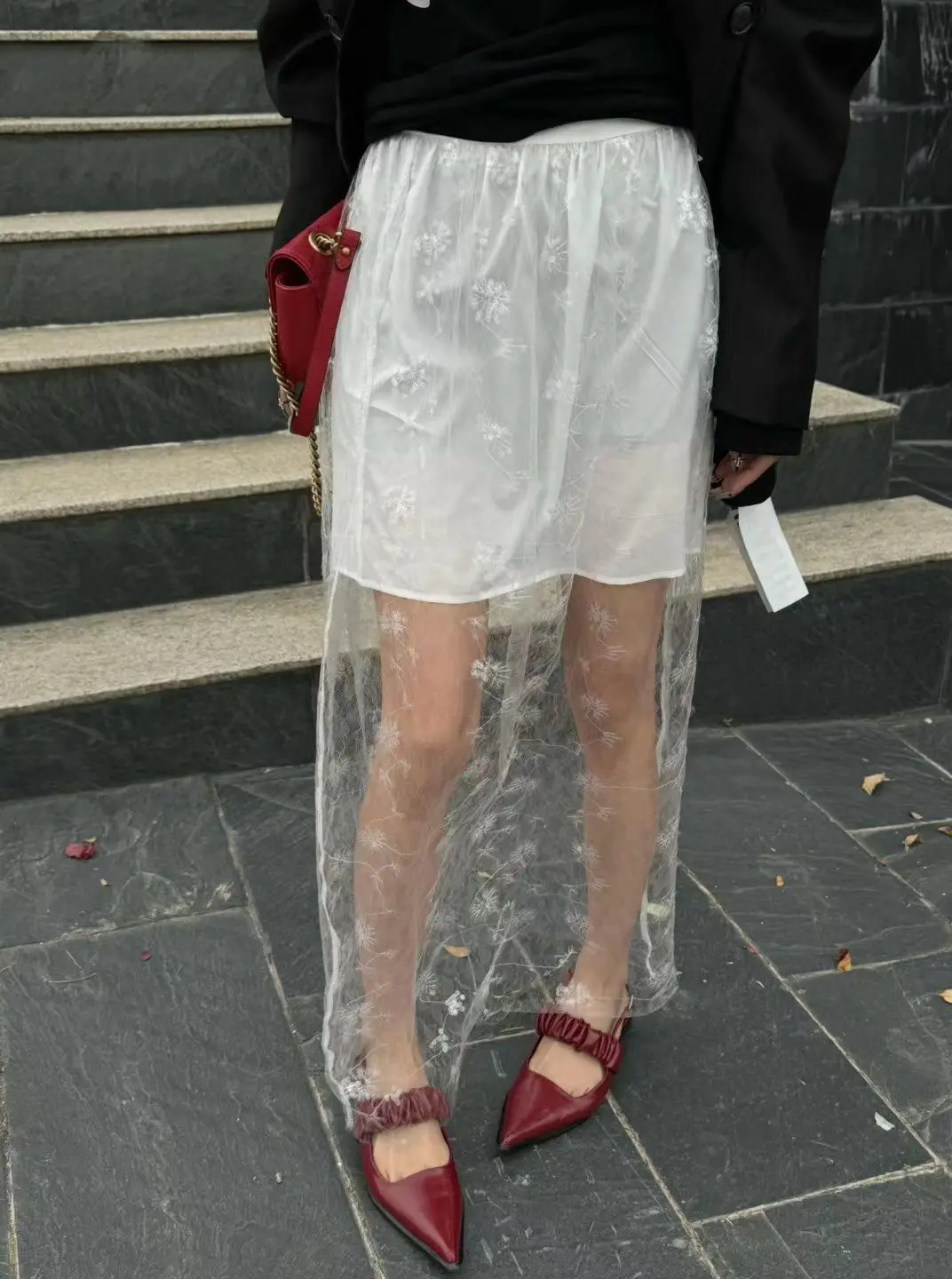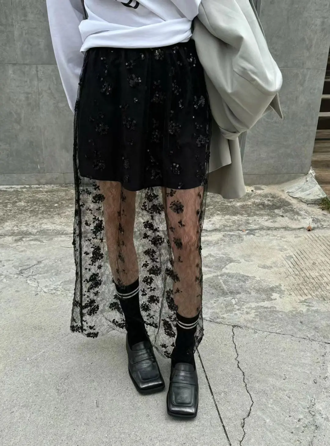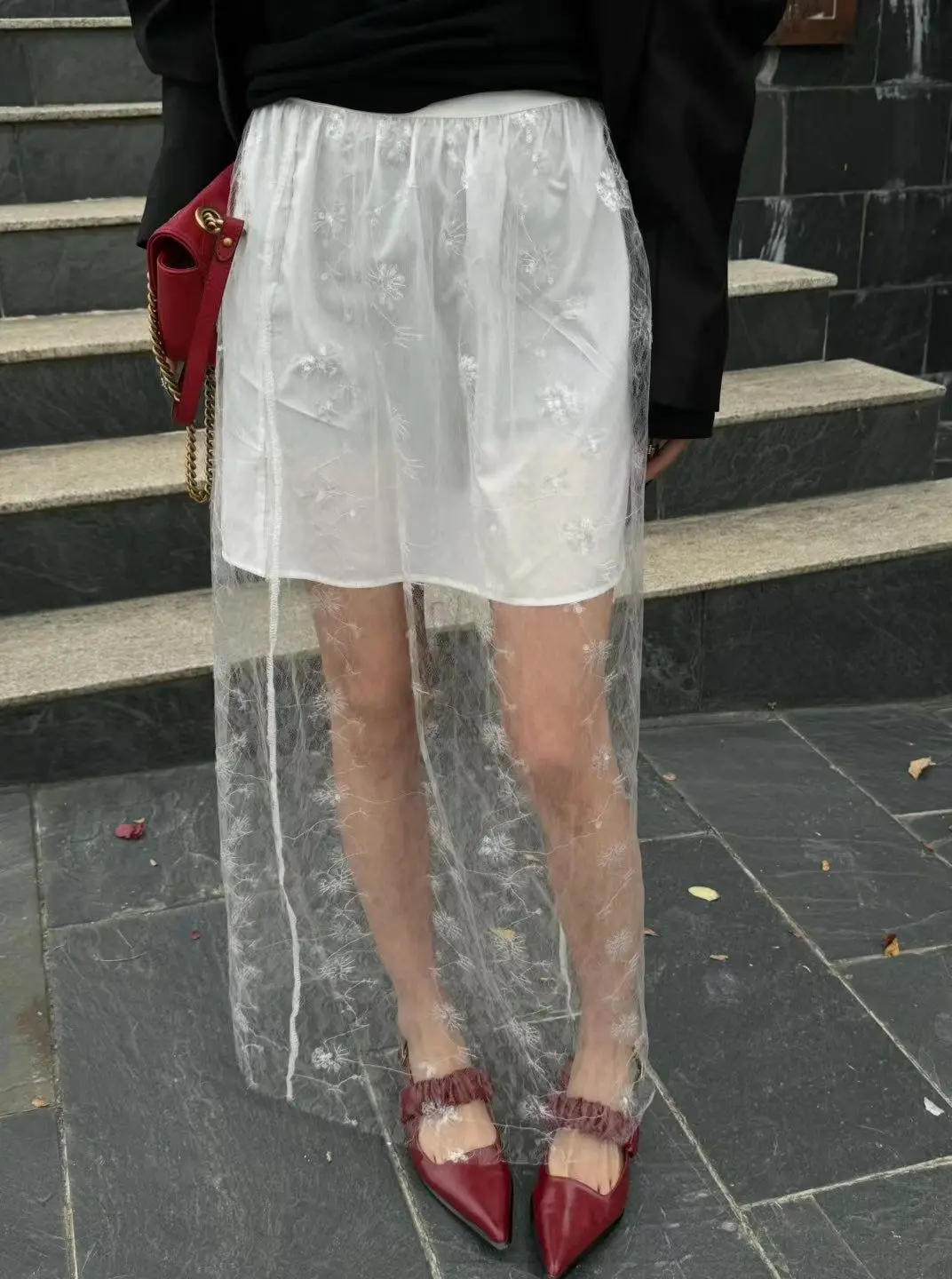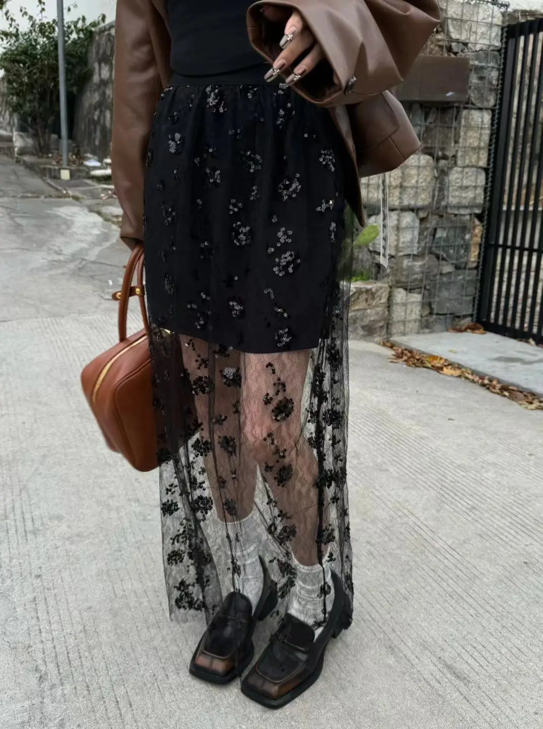 qgtao See Through Long Skirt Women White Korean Fashion High Waist A-line Sequin Lace Patchwork Sexy Transparent Mesh Skirt