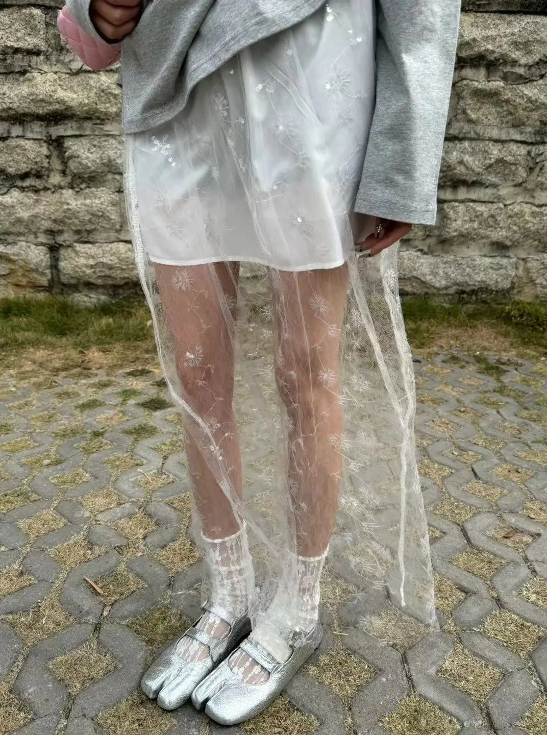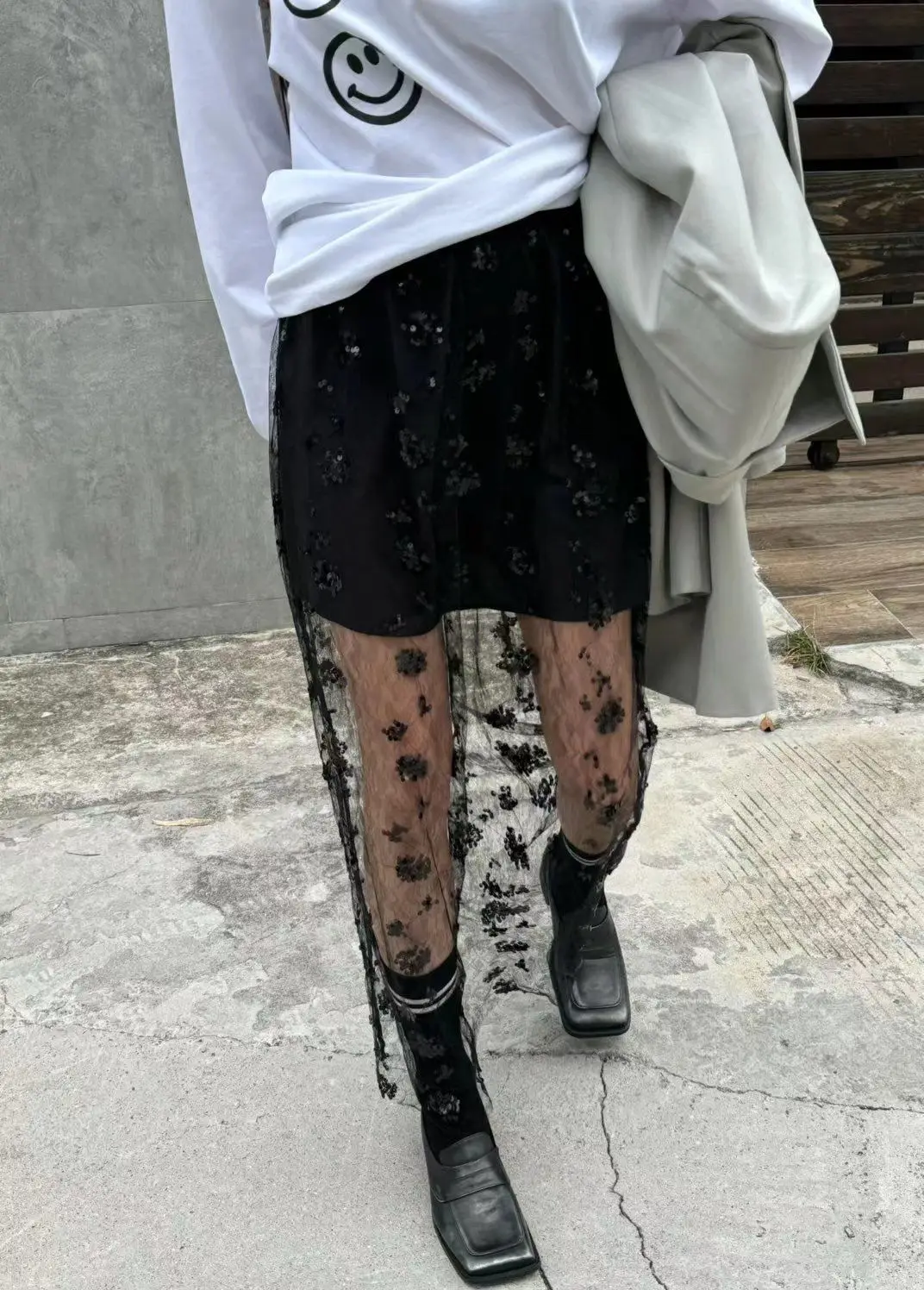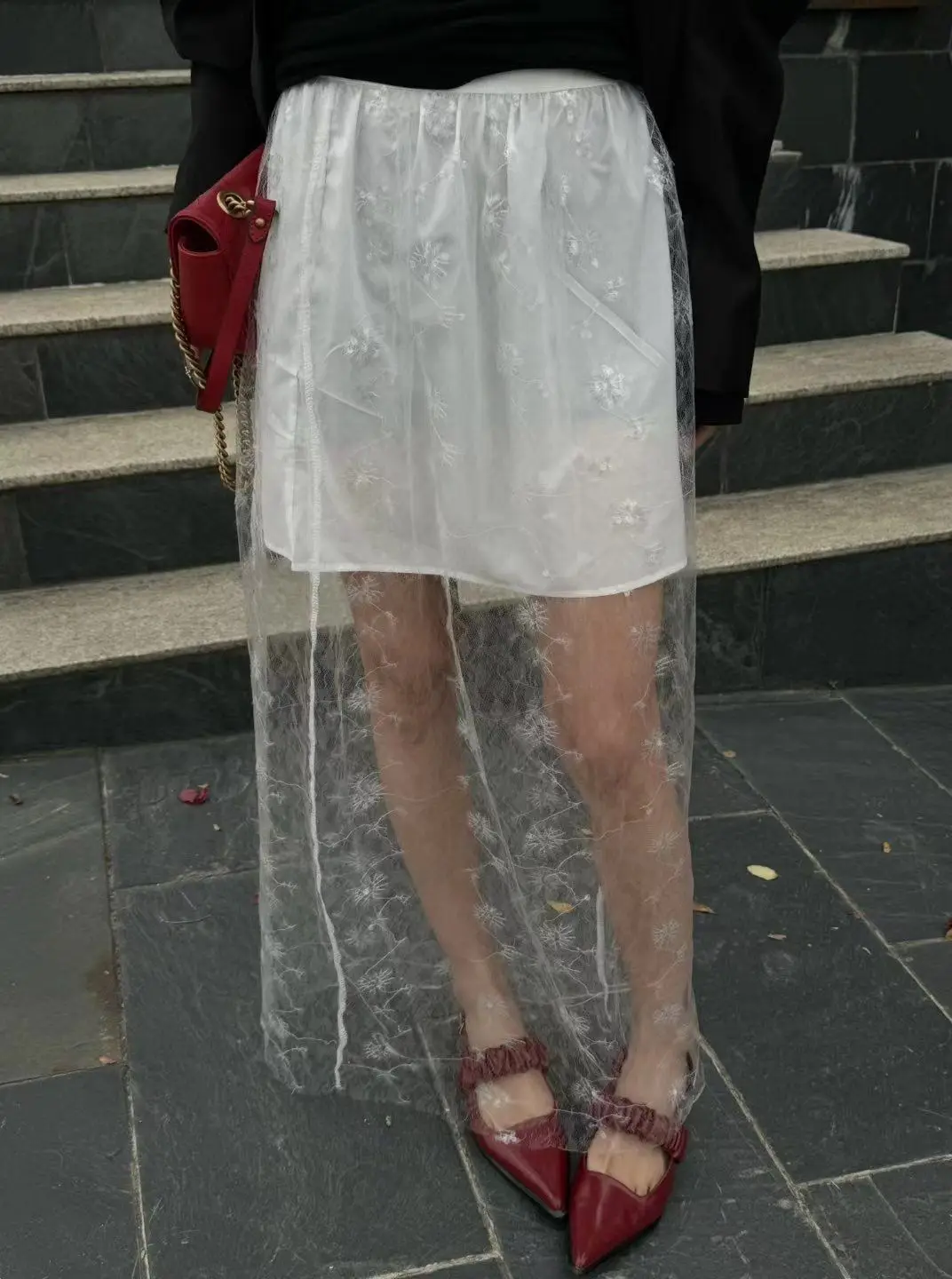 qgtao See Through Long Skirt Women White Korean Fashion High Waist A-line Sequin Lace Patchwork Sexy Transparent Mesh Skirt