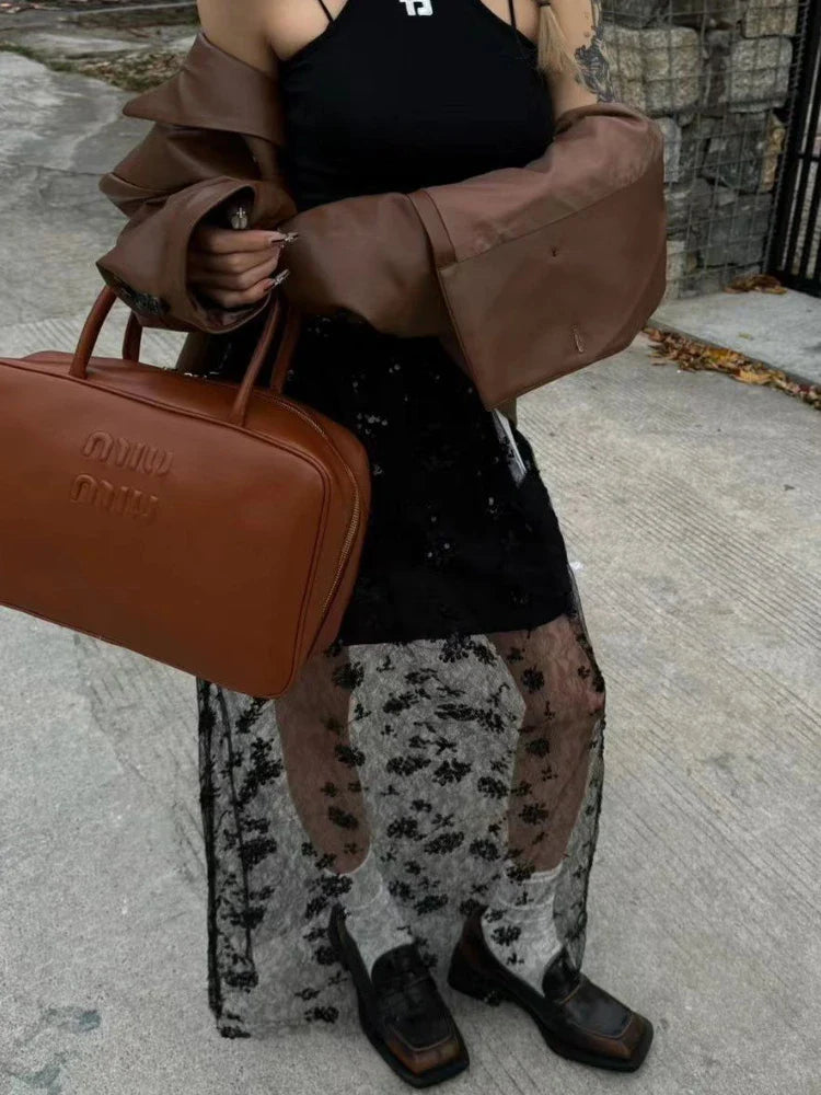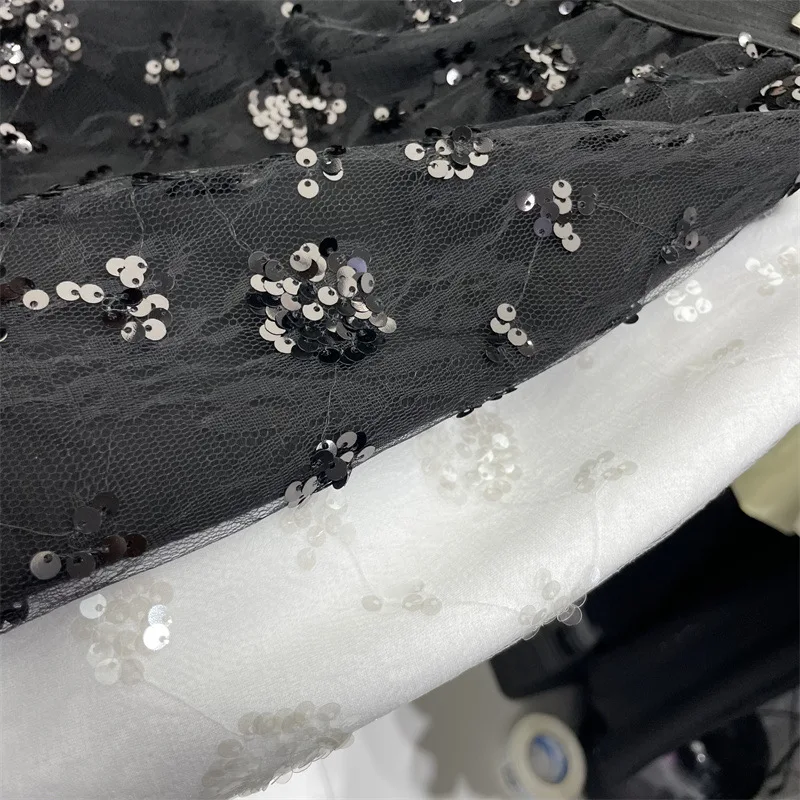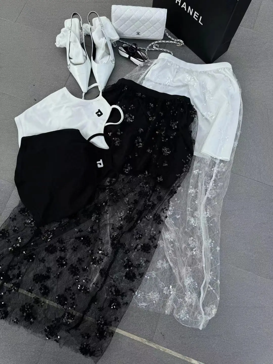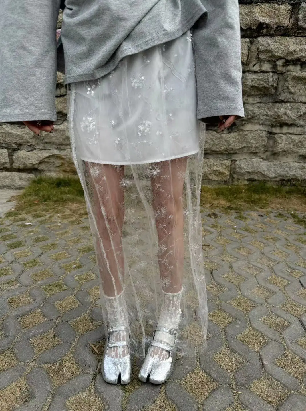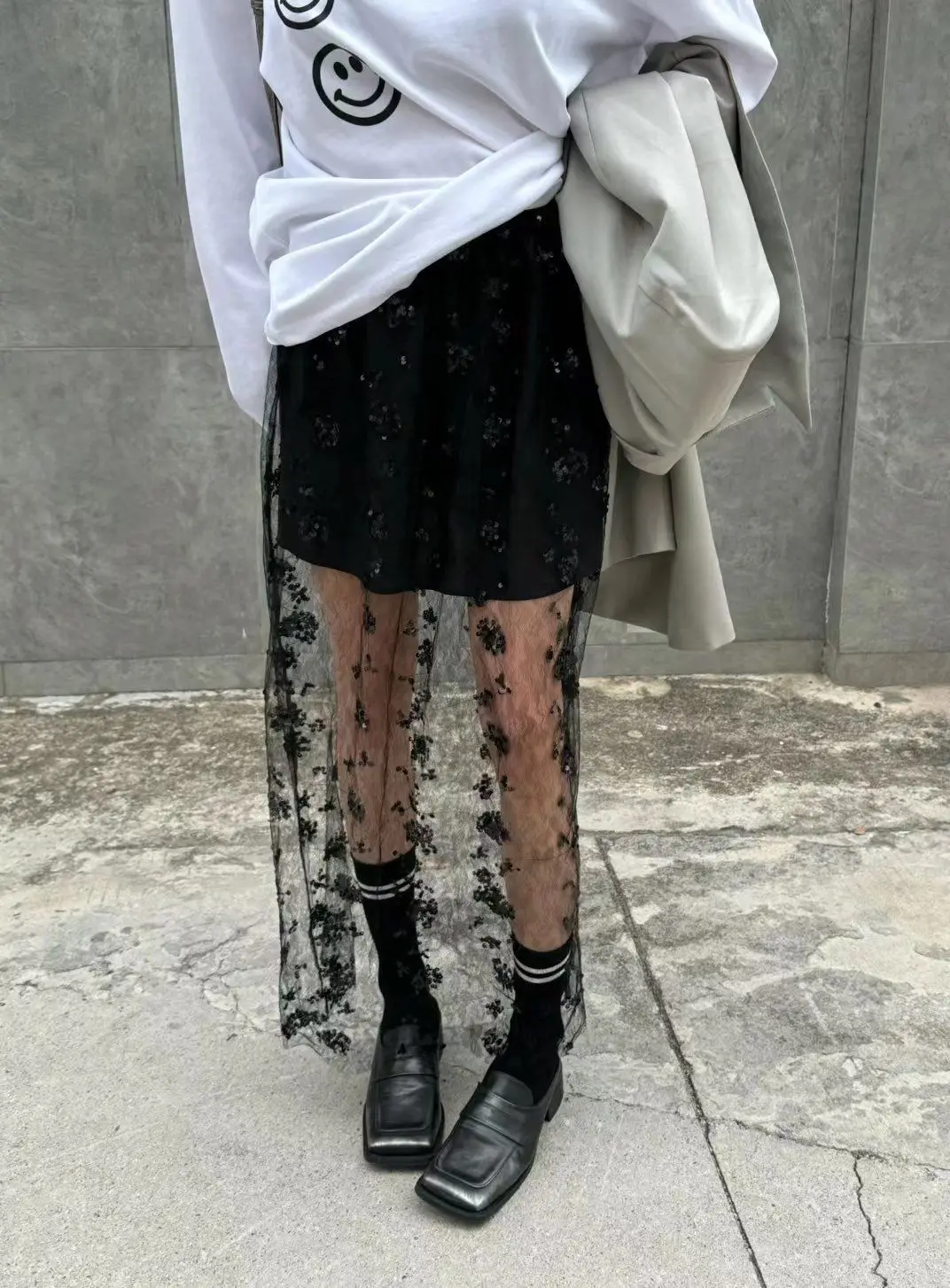 qgtao See Through Long Skirt Women White Korean Fashion High Waist A-line Sequin Lace Patchwork Sexy Transparent Mesh Skirt