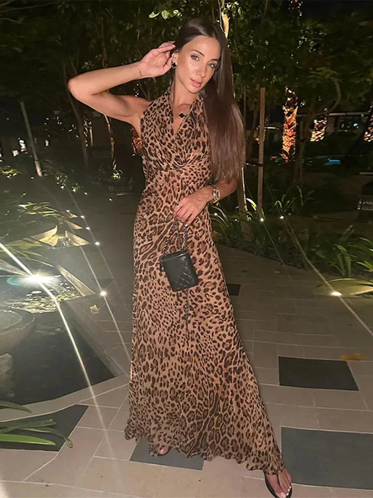 qgtao Sexy Leopard Print Halter V Neck Maxi Dress Women Elegant Off Shoulder Sleeveless Slim Dresses Lady Evening Banquet Party Robes
