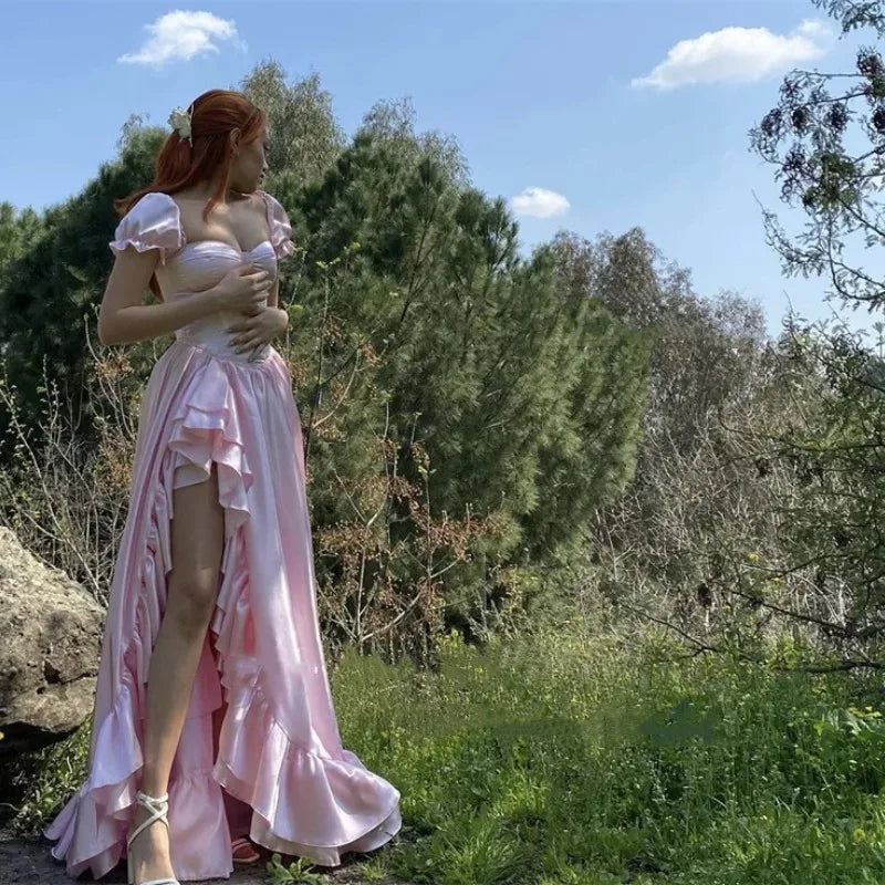 qgtao Sexy Sweet heart Pink Prom Party Dresses Detachable Short Sleeves Ruffles Silk Split Evening gowns Formal Sexy Dresses For Woman
