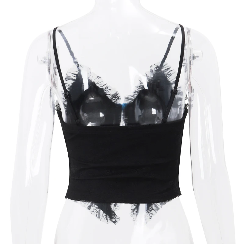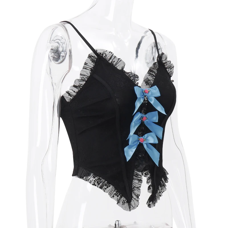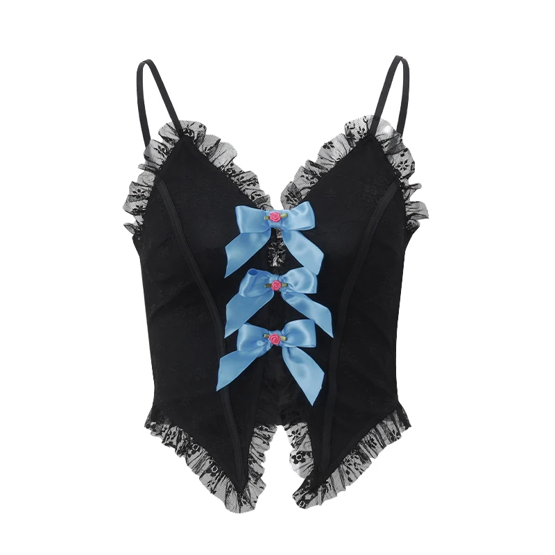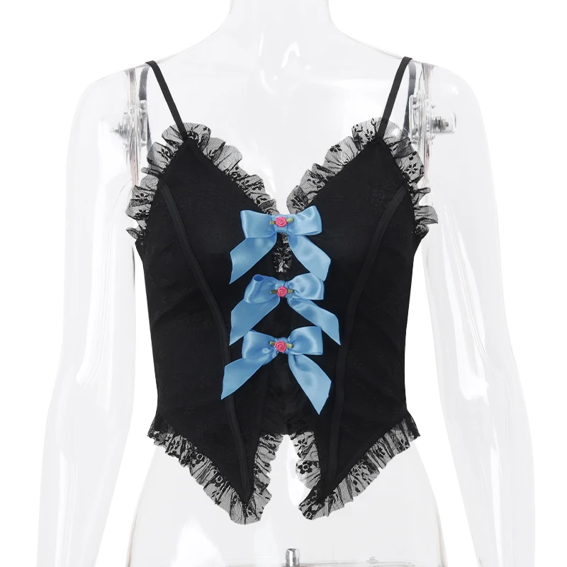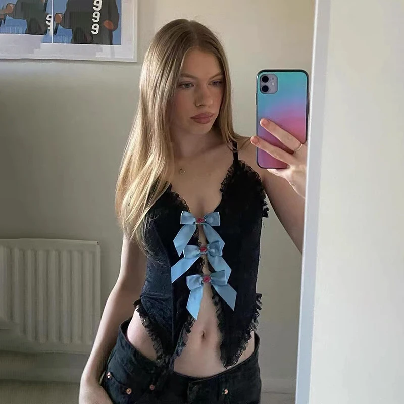qgtao - Sexy Y2K Top Bow V-neck Hollow Sleeveless Crop Tops Summer Korean Lace Fashion Club Nightclub T-shirt Women's Vest