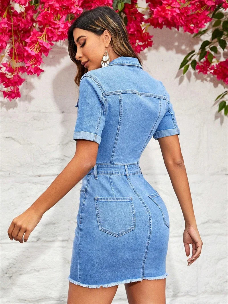 Streetwear Jean Jacket Dress Women Summer Y2K Clothing Short Sleeve Button Up Mini Dress Vintage Cowboy Denim Dress Vestidos