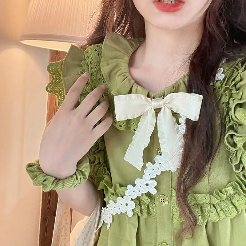qgtao Summer Green Kawaii Lolita Dress Women Bow Designer Party Mini Dress Female Casual Korean Fashion Lace Elegant Cute Dress 2023