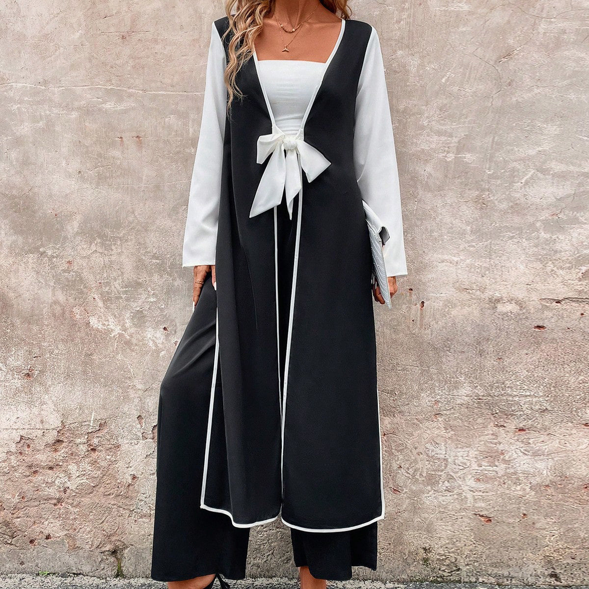 uniforms dress to impress Women's Fashionable Casual Long Contrast Color Cardigan Lace-up Side Slit Top Wide Leg Trousers Suit