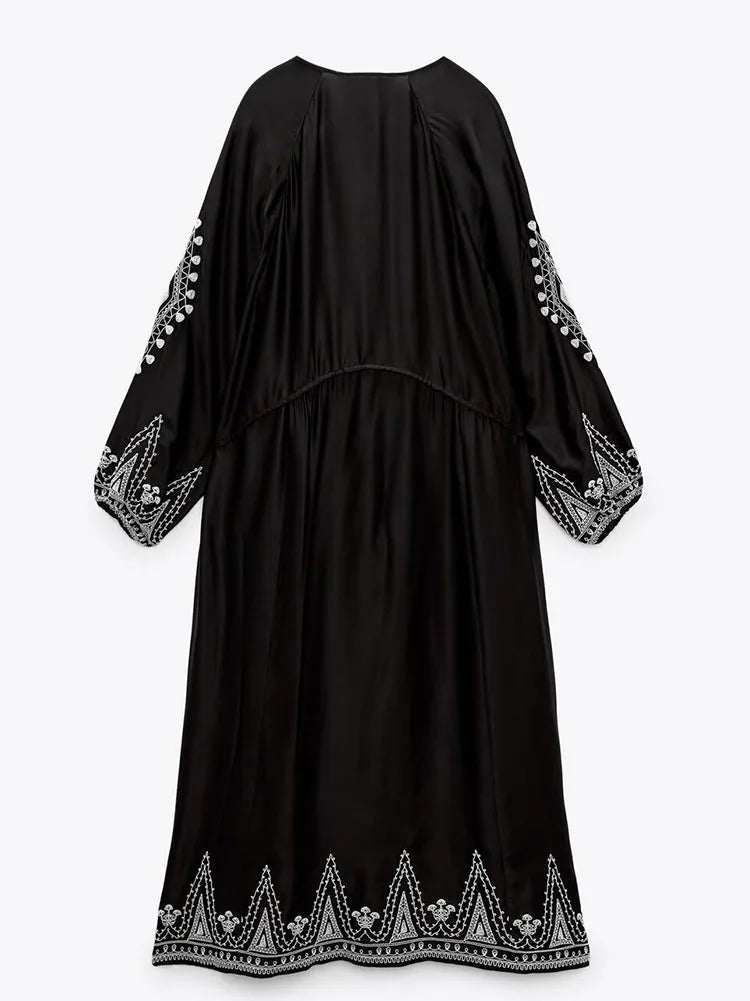 qgtao Vintage Floral Embroidery Maxi Dresses Cotton Black Long Sleeve V-neck Spring Autumn Women Holiday Ladies Dress New