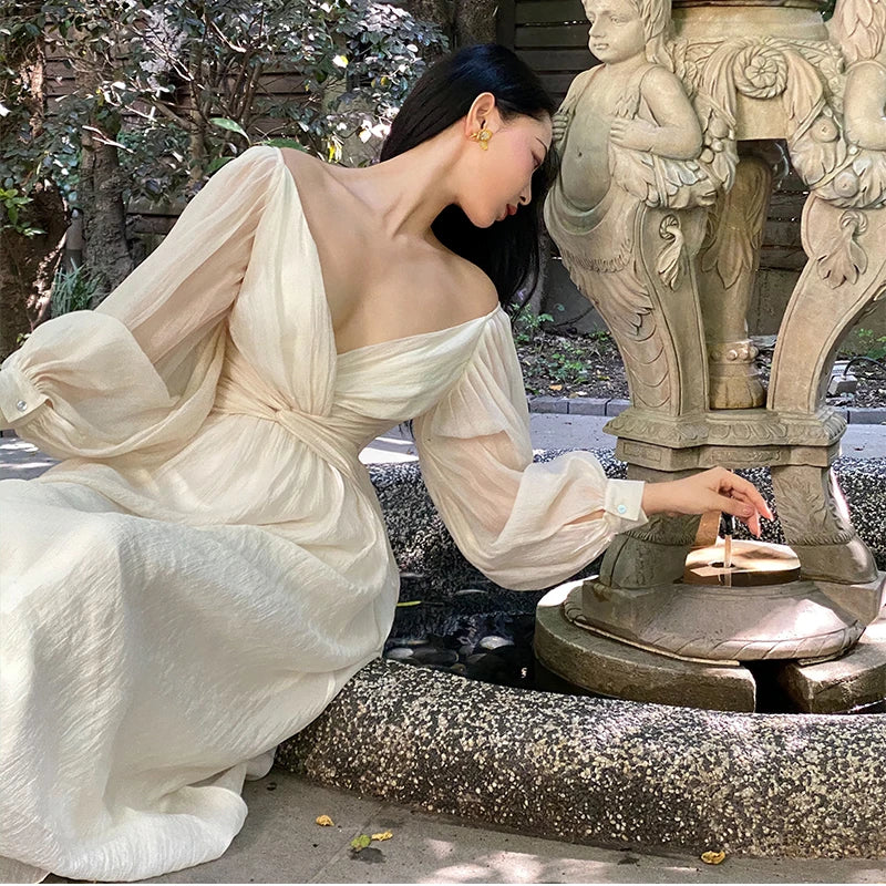 qgtao Vintage Korean V-neck Pleated Maxi Dresses for Women Ladies Party Fringed Lace Puff Sleeve Ruffled Lady Dreses Elegant Summer