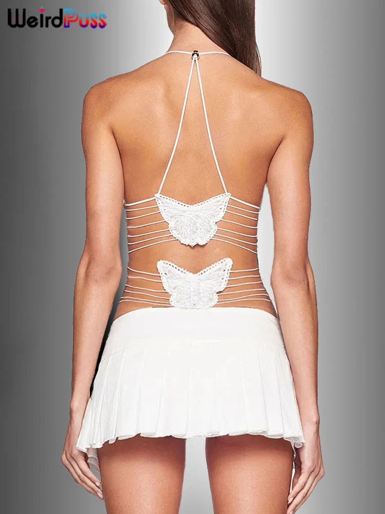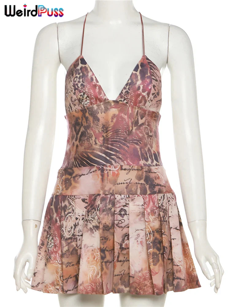 qgtao Weird Puss Letter Print Dress Women Sexy Backless Bow Bandage Adjustable Bandage Side Zipper Ruched Vacation Beach Mini Vestidos