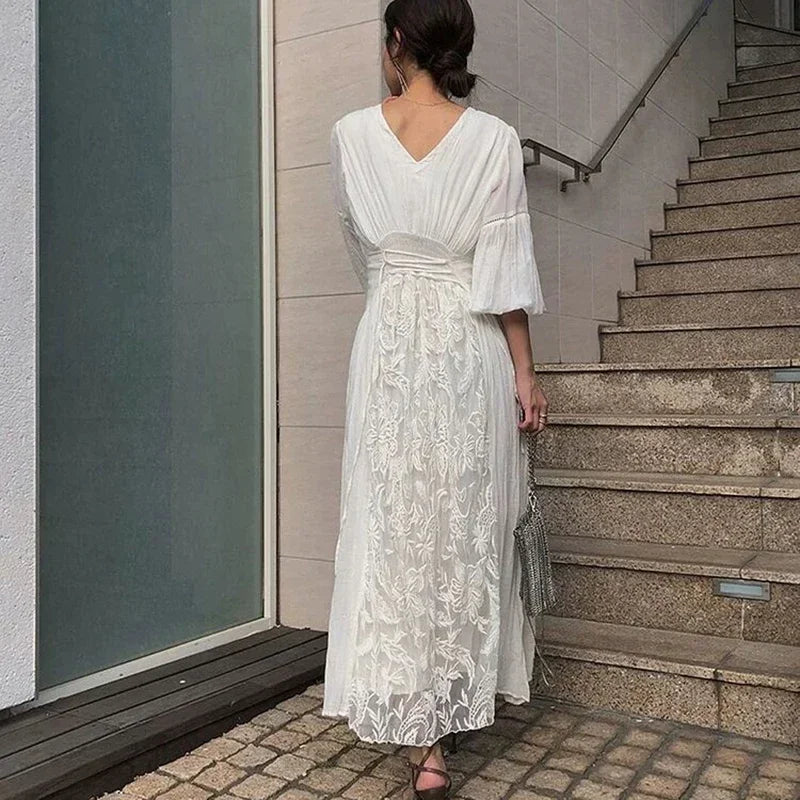 qgtao White Floral Embroidery Maxi Dress Vintage Boho Long Lantern Sleeve Dress Women V-neck Holiday Sexy Ladies Dresses
