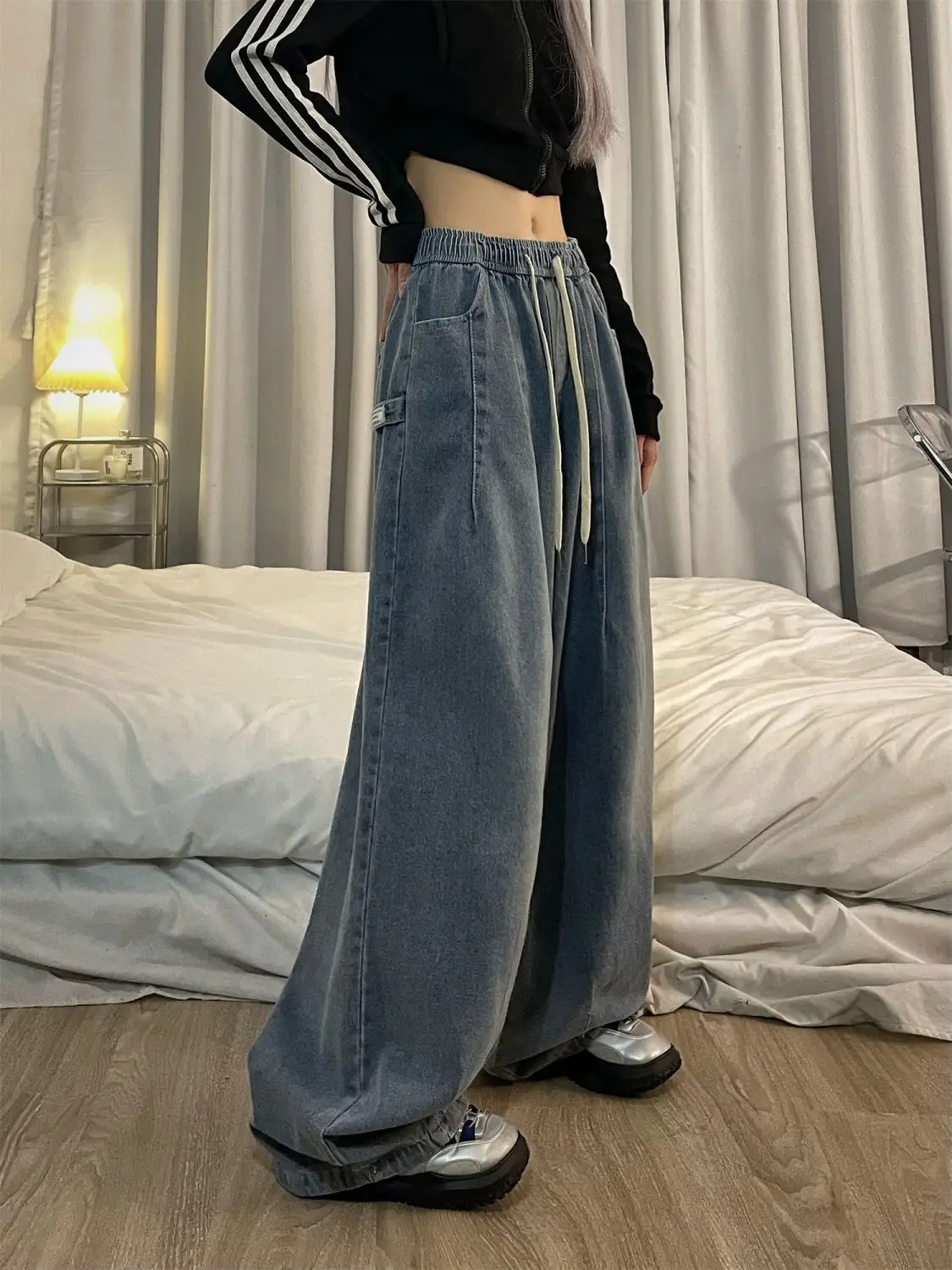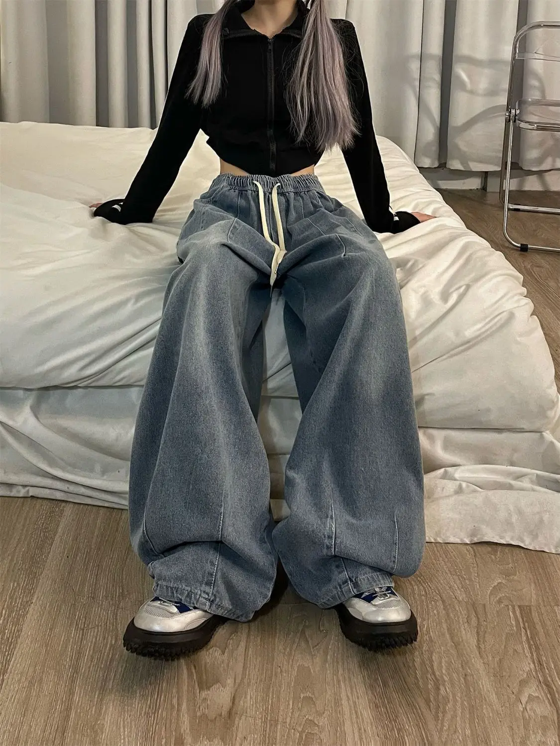 qgtao Women Vintage Baggy Jeans Y2K Elastic High Waist Oversize Street wear Trouser Denim Wide Leg Straight Basic Pants Spring
