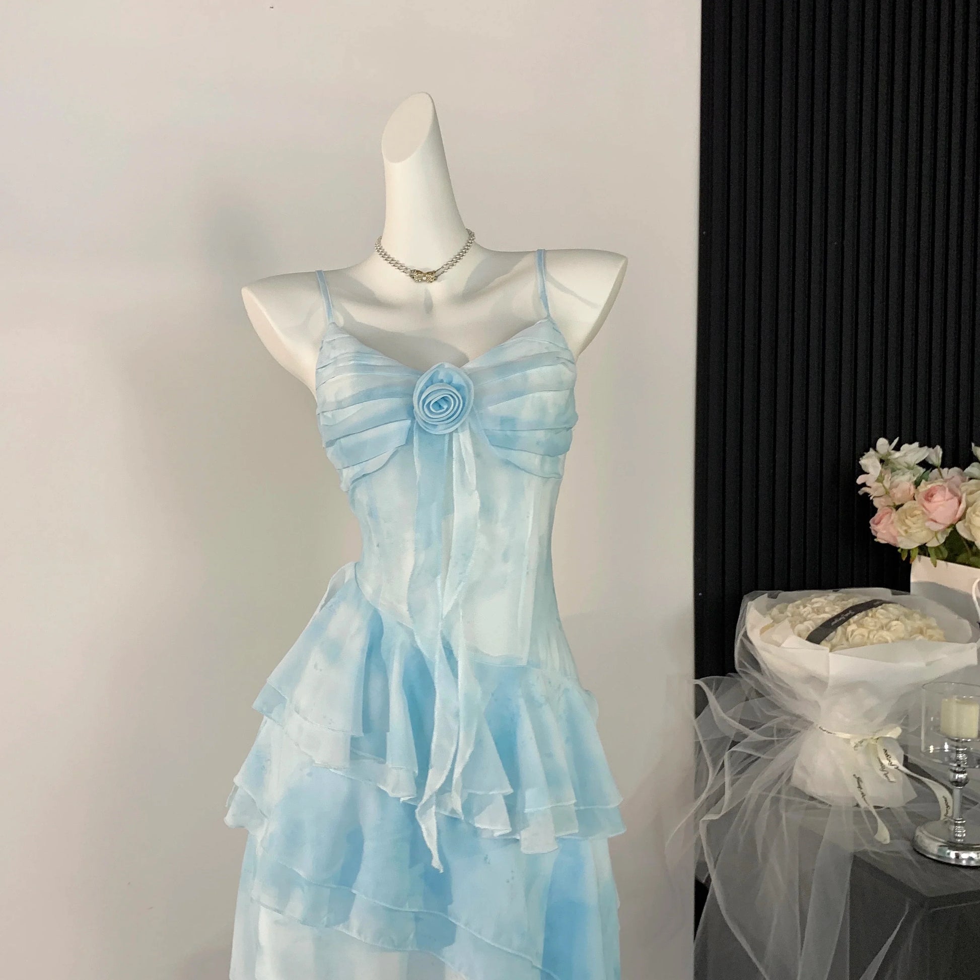 qgtao Women's Blue A-line Chiffon Dress Elegant Mini Dress Vintage Y2k Sleeveless Off Shoulder One Piece Frocks 2000s Clothes Summer