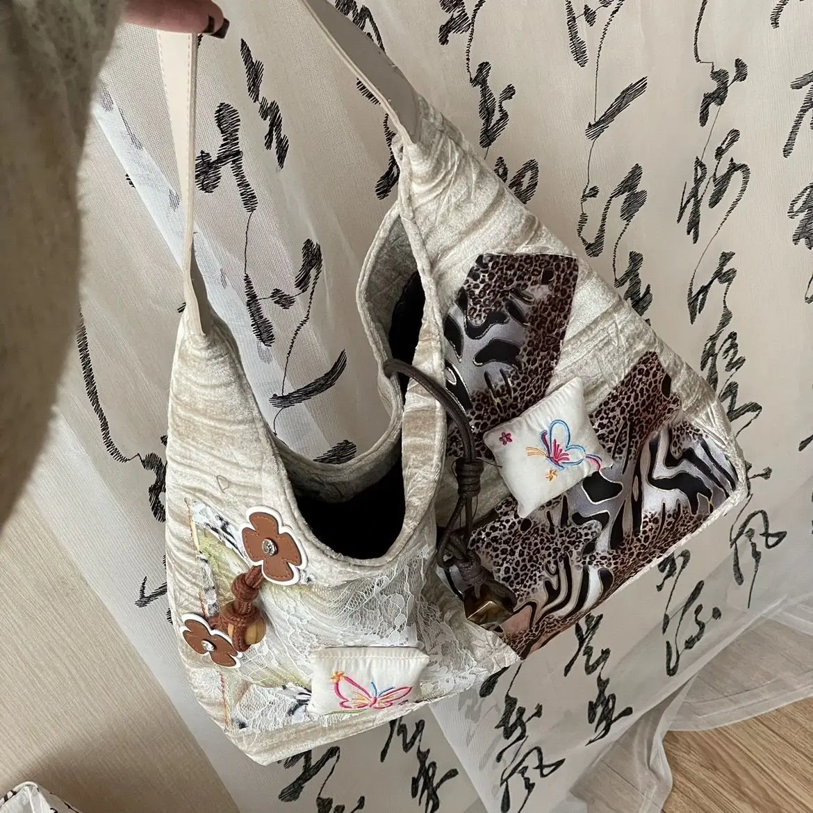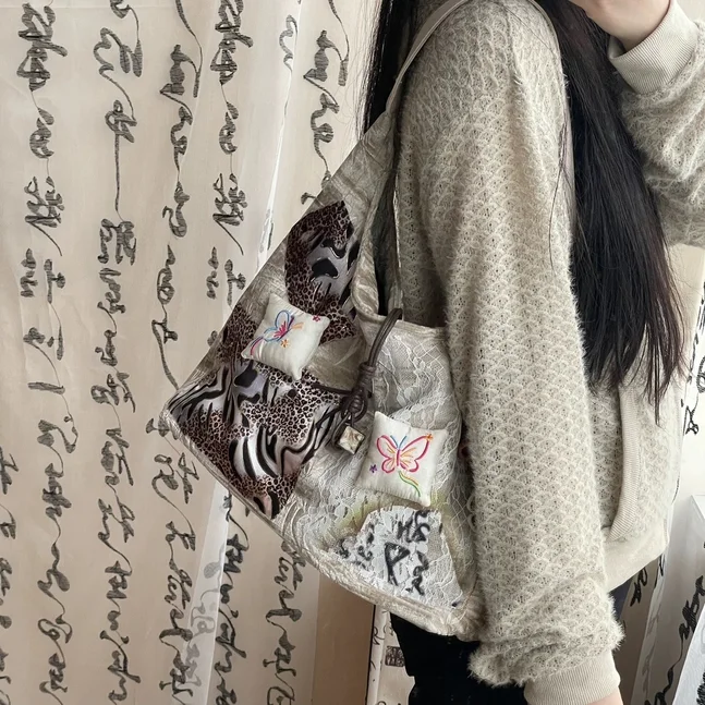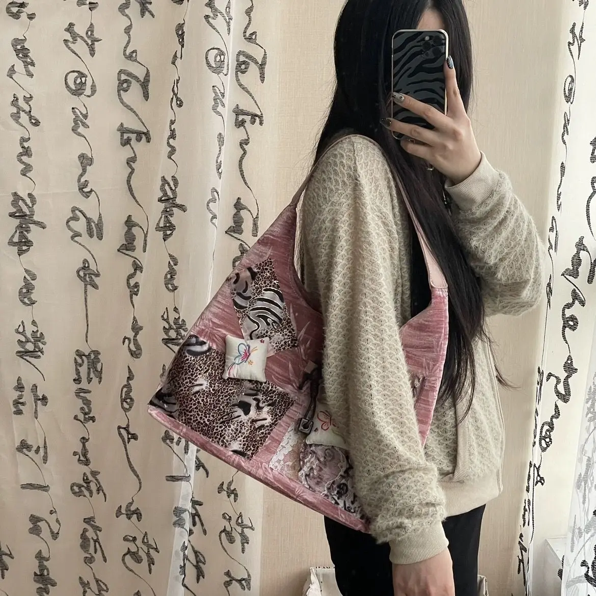 qgtao Y2k Vintage Tote Bag Aesthetic Patchwork Fashion Chinese Style Leopard Print Shoulder Bag Original Designer Ladies Handbag