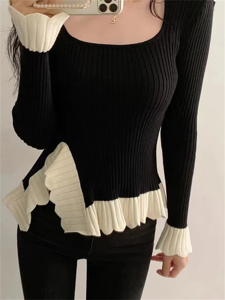 Tossy Ruffled Patchwork Vintage Pullover Sweater For Women Ribbed Contrast Elegant Long Sleeve Loose Knit Female Pullover 2024