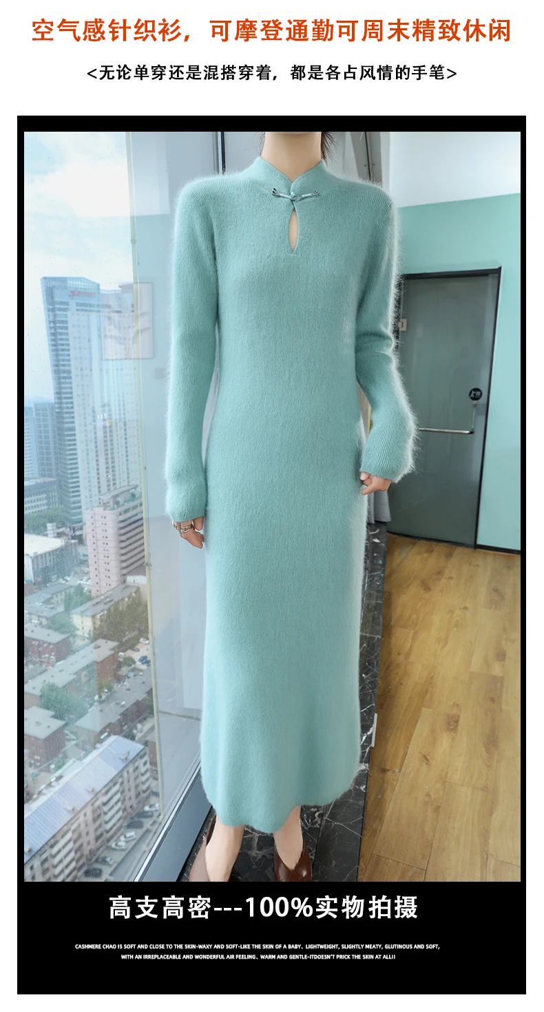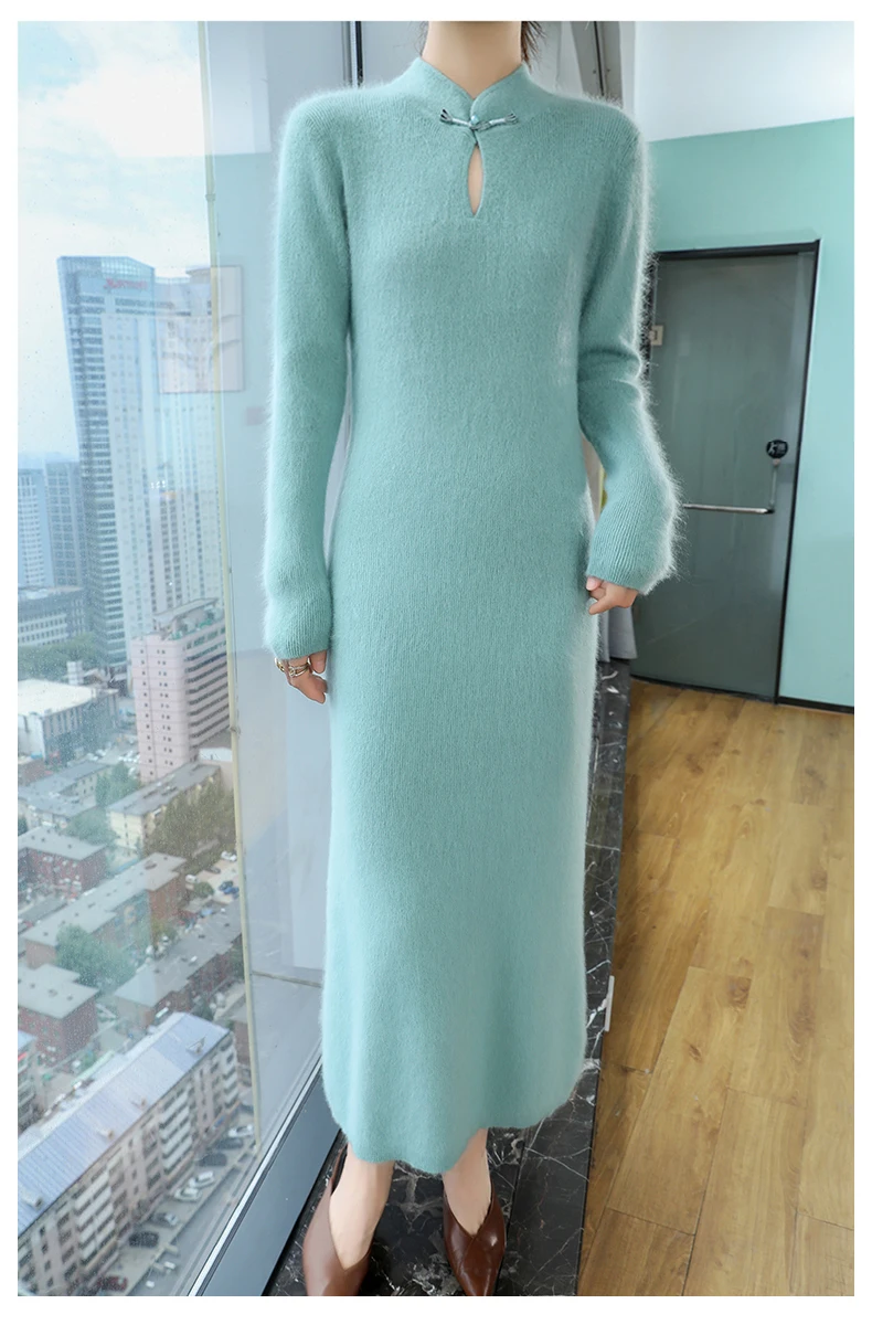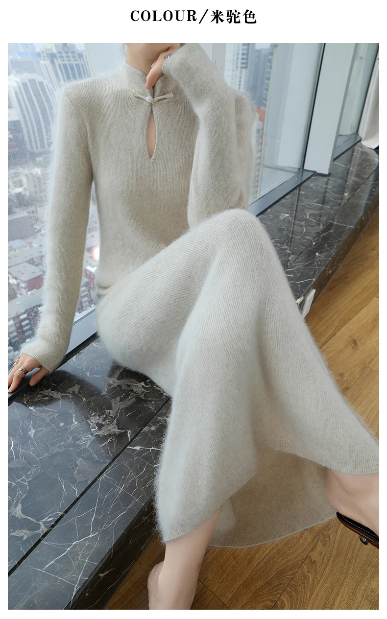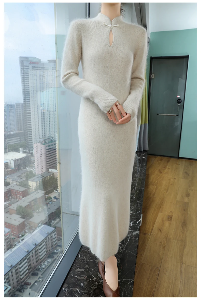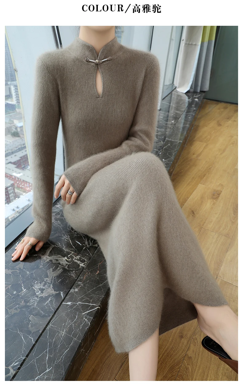 qgtao 100% Mink Cashmere Dress Women's Stand up collar Pullover Long Skirt Slim Fit Fashion Long Warm Dress Autumn Winter Solid Color