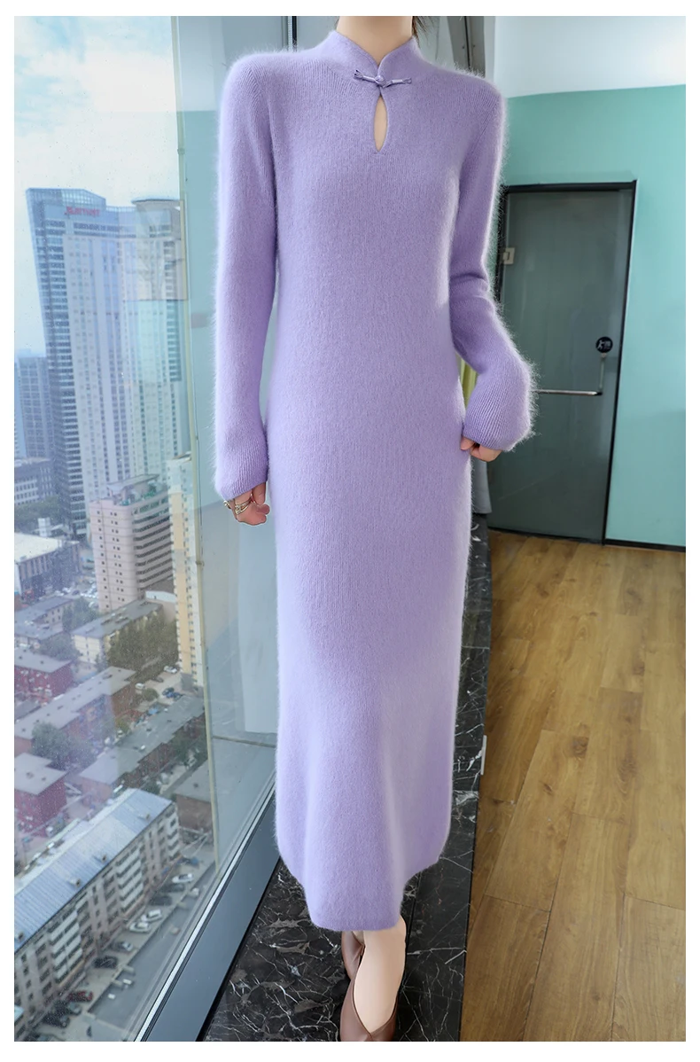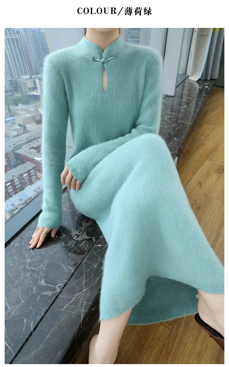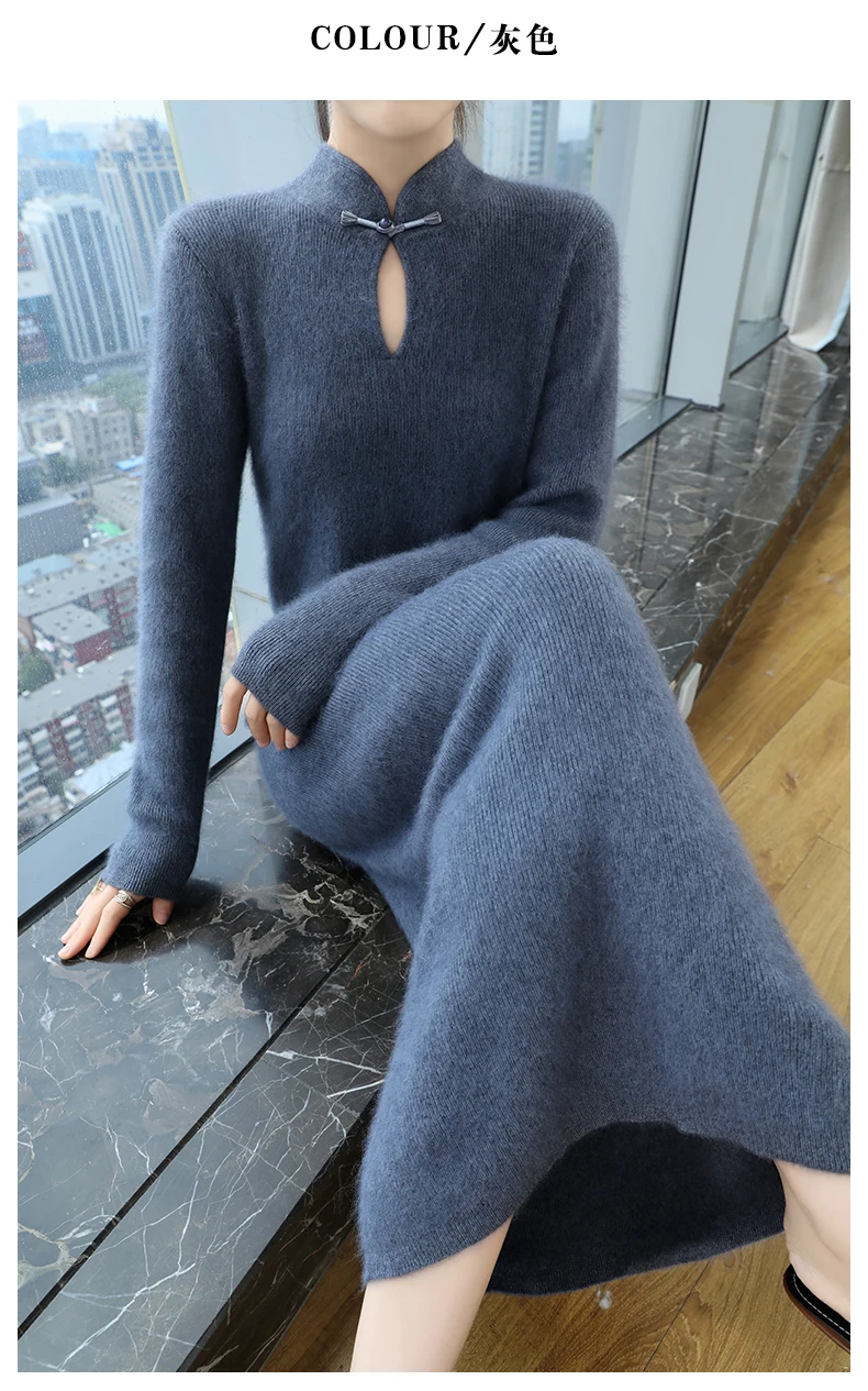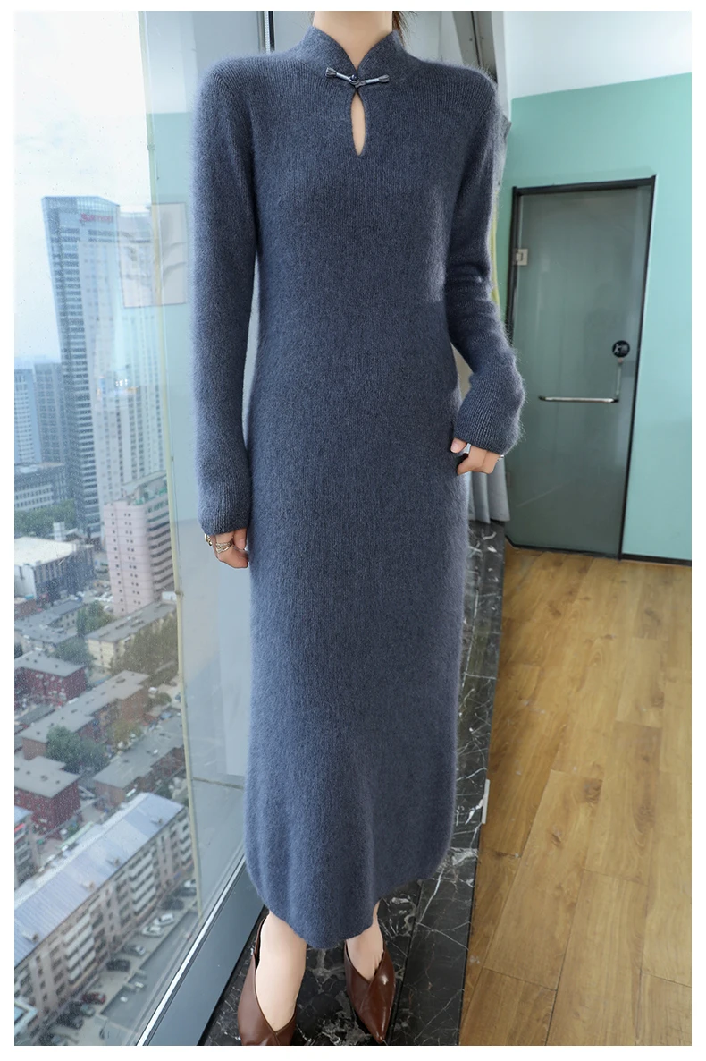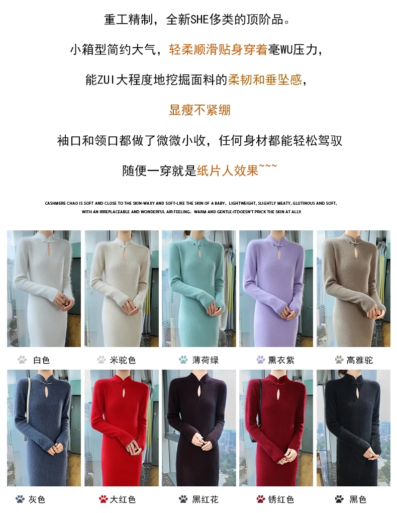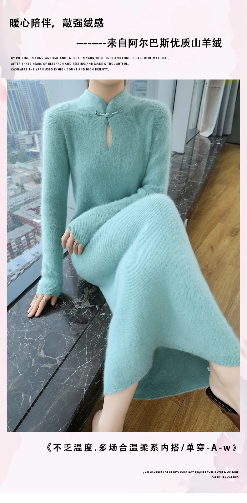 qgtao 100% Mink Cashmere Dress Women's Stand up collar Pullover Long Skirt Slim Fit Fashion Long Warm Dress Autumn Winter Solid Color