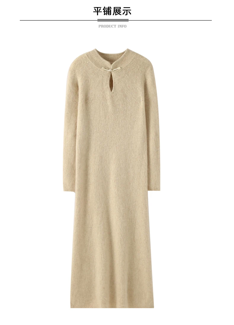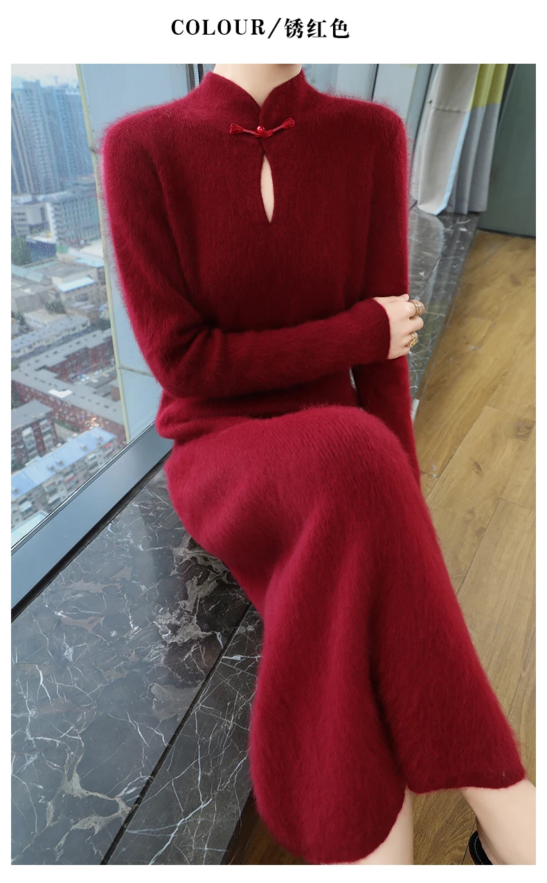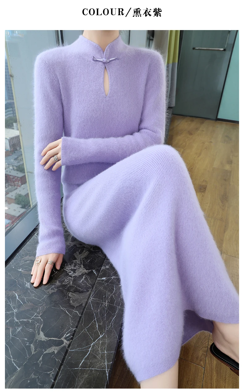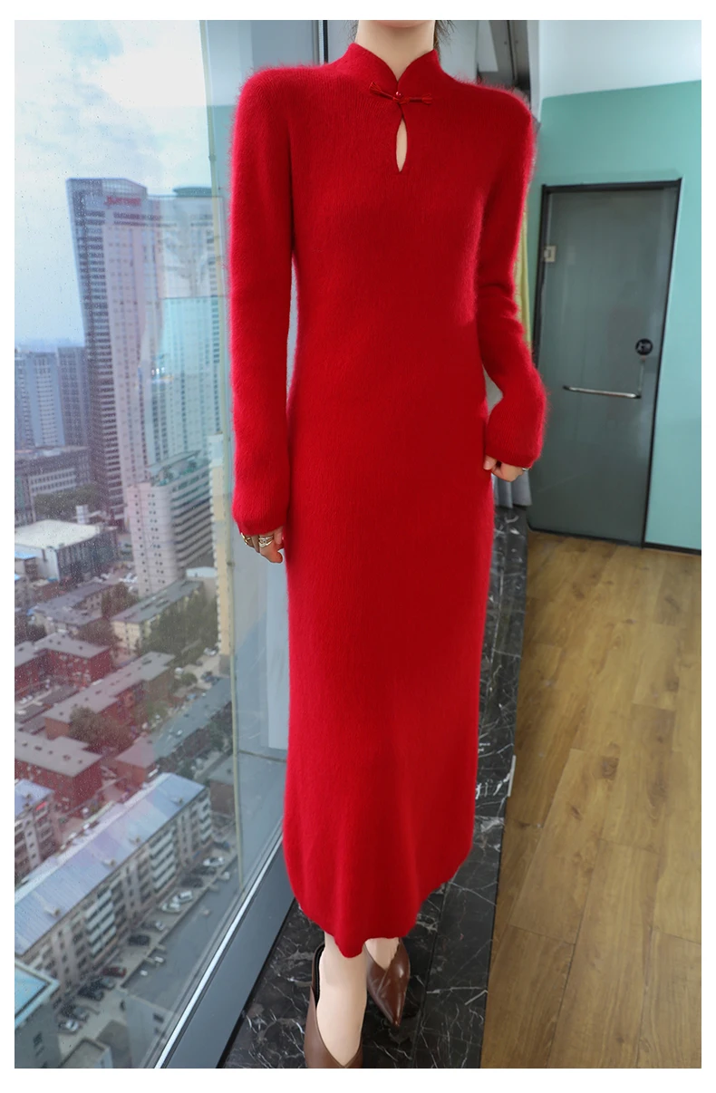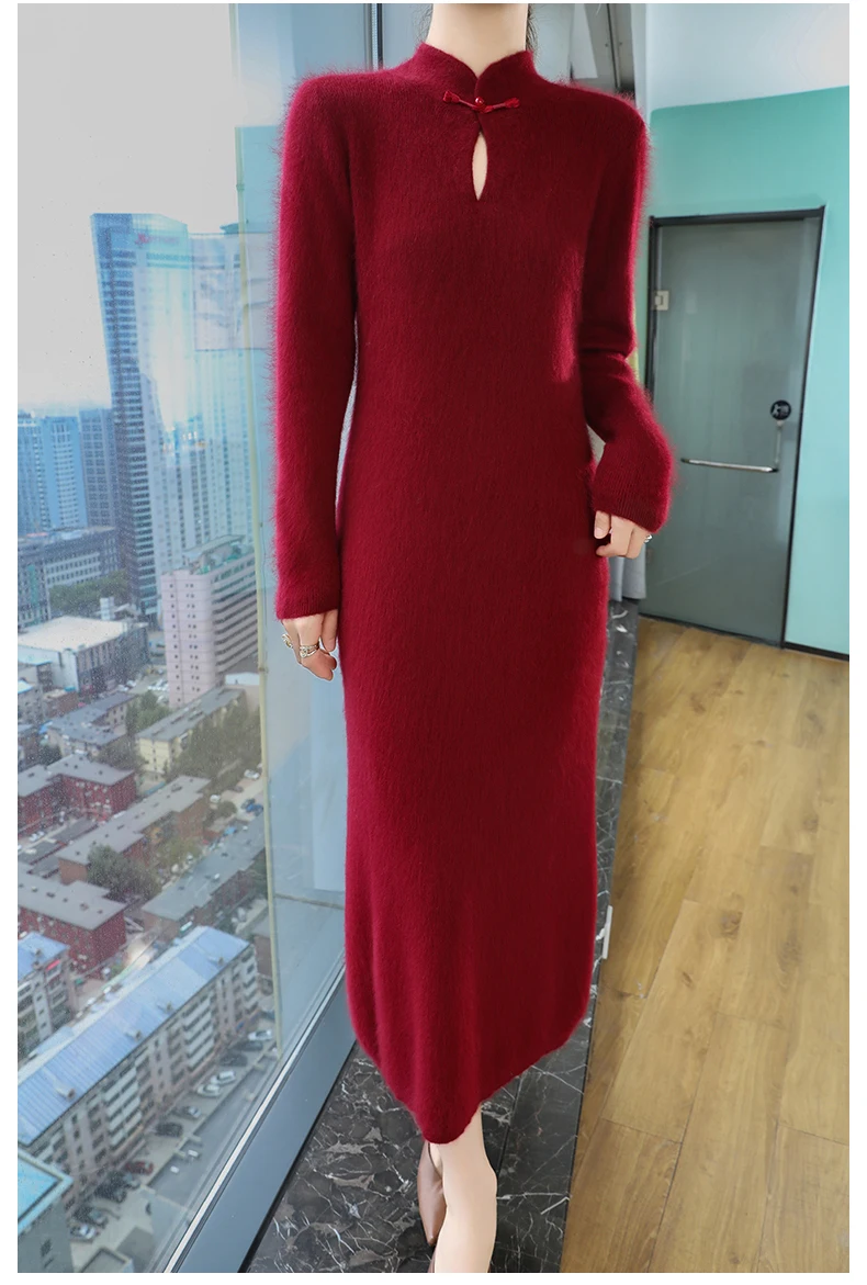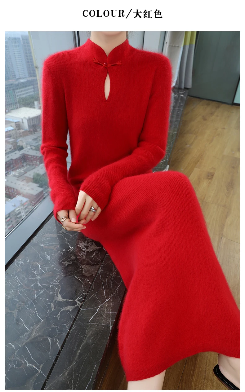 qgtao 100% Mink Cashmere Dress Women's Stand up collar Pullover Long Skirt Slim Fit Fashion Long Warm Dress Autumn Winter Solid Color