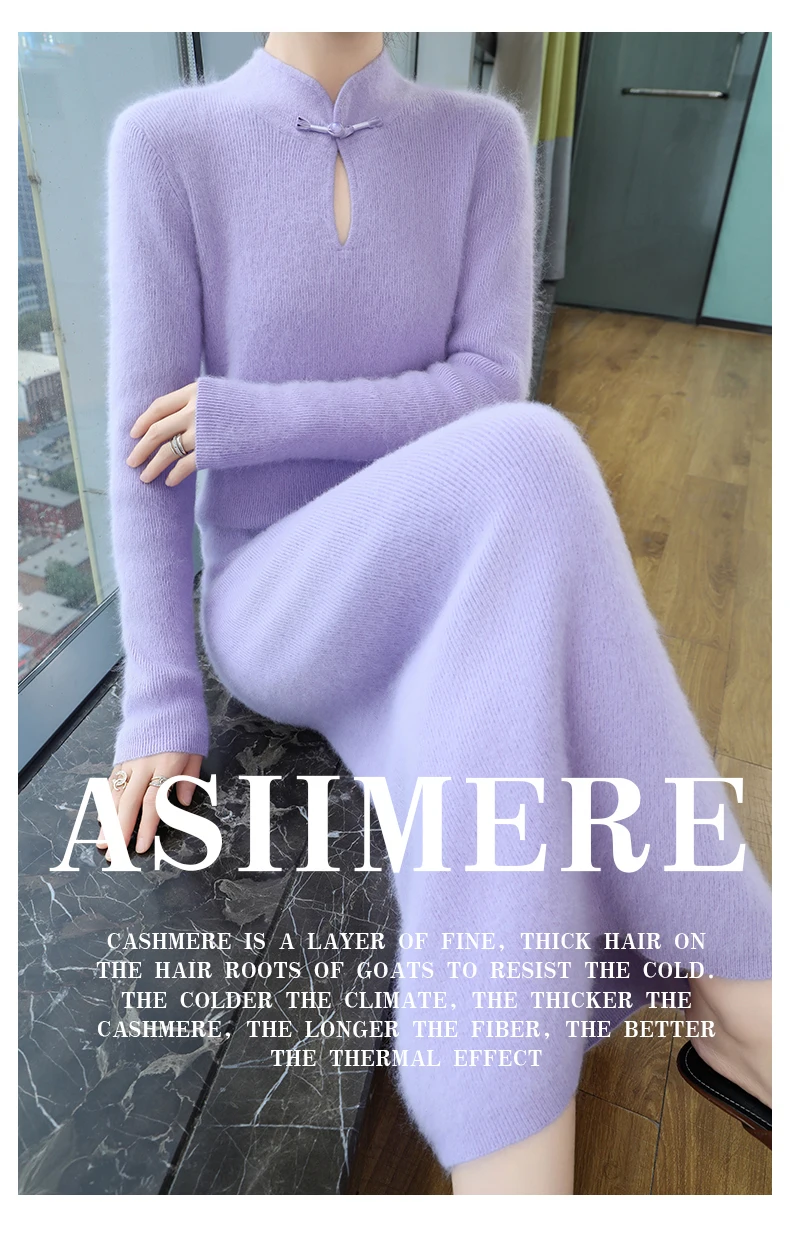 Uniwim 100% Mink Cashmere Dress Women's Stand up collar Pullover Long Skirt Slim Fit Fashion Long Warm Dress Autumn Winter Solid Color